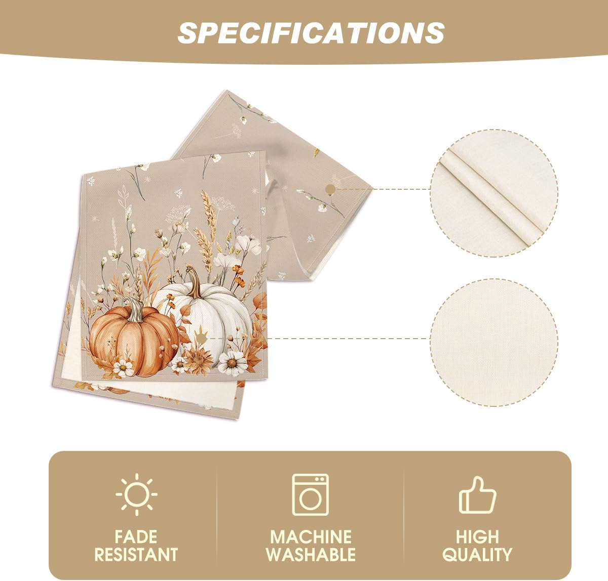 Artoid Mode Pumpkins Leaves Flowers 210 GSM Fall Table Runner, Seasonal Autumn Kitchen Dining Table Decoration for Home Party Decor 13x72 Inch