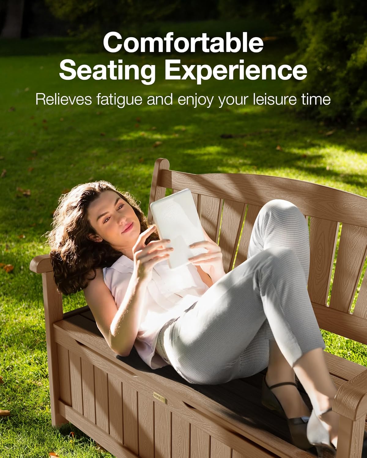 - Large Storage Capacity and Increase Space Utilization: 43-gallon large-capacity outdoor storage bench can store patio furniture cushions, gardening tools, pool accessories, and more. Buy YEFU patio bench with storage to make more space for your home, keep your yard environment neat, and increase space utilization.