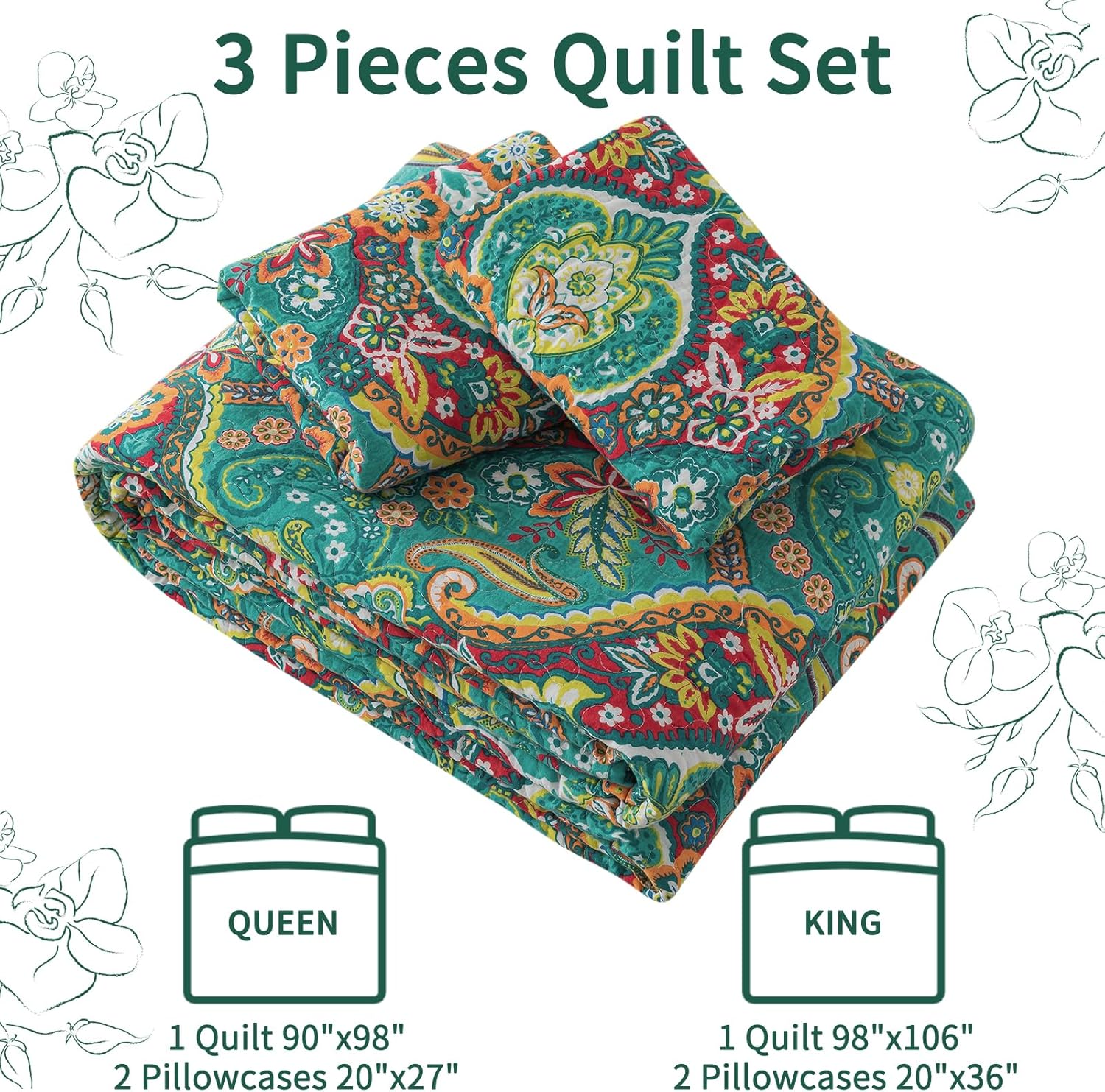 VAPUTAR Cotton King Quilt Bedding Set - 3Pieces Quilt King Size with Floral Pattern, Soft Lightweight Quilted King Size Bedspread (98*106 inch), Reversible Bedspread Coverlet Suitable for All Season
