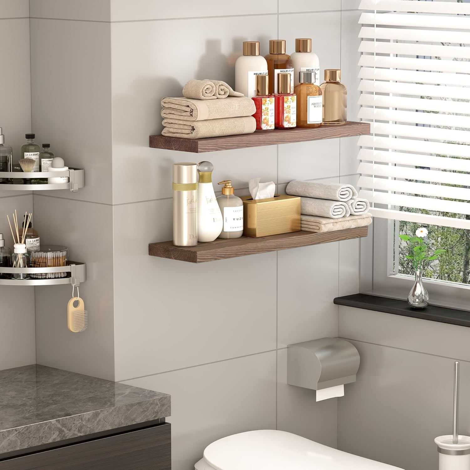 - MULTIFUNCTIONAL DECORATIVE SHELVES: Modern rustic style floating wall shelves are suitable for a variety of scenarios. Use it in the kitchen to store spices, bottles, cups; install it in the bathroom to store shampoo, conditioner, body wash and more. Also perfect for bedroom, living room, office, etc., beautiful and space-saving