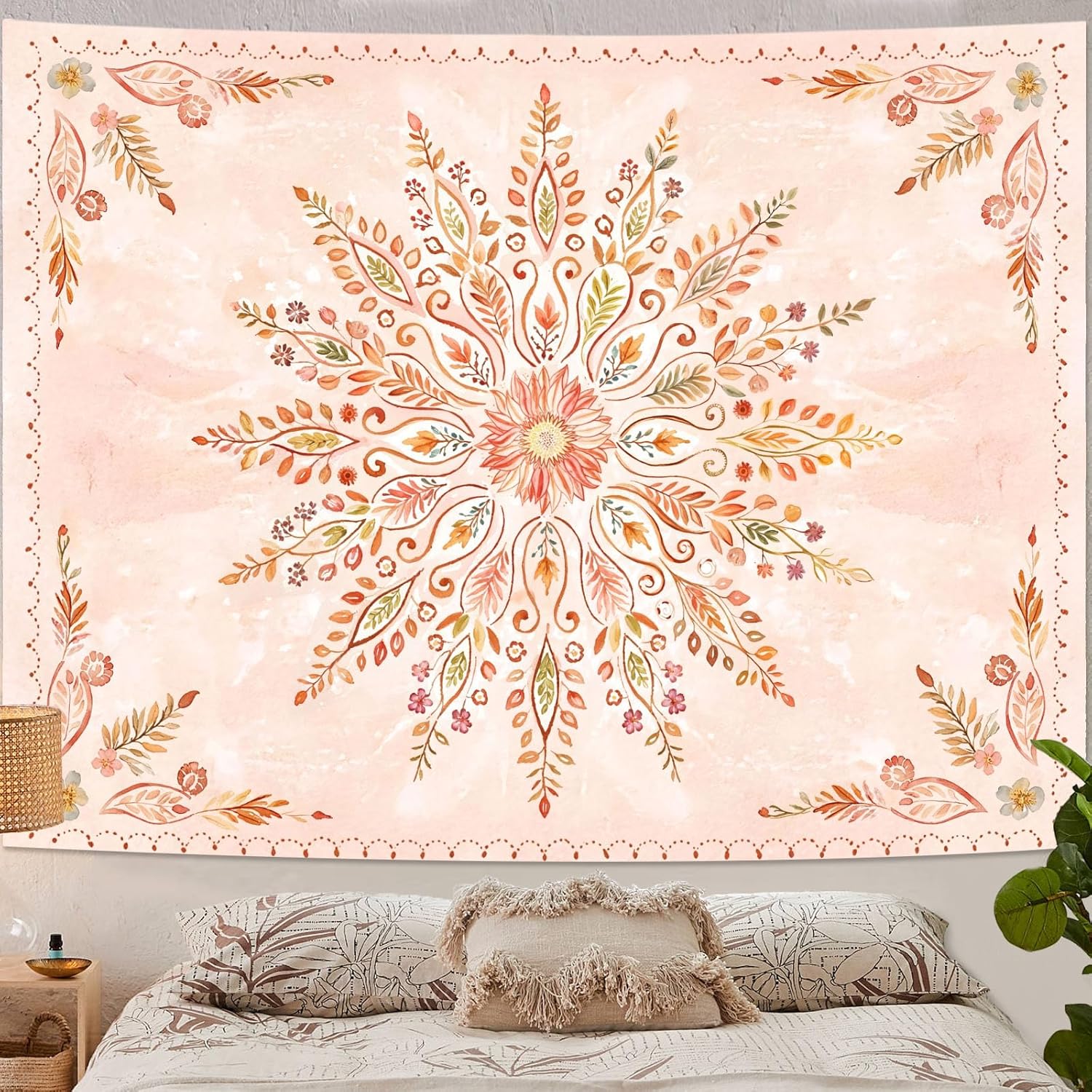 - Delicate Floral Mandala Design: This Lunerfex tapestry features a beautiful floral mandala pattern with soft pink tones, adding a serene and artistic touch to your bedroom or living room.