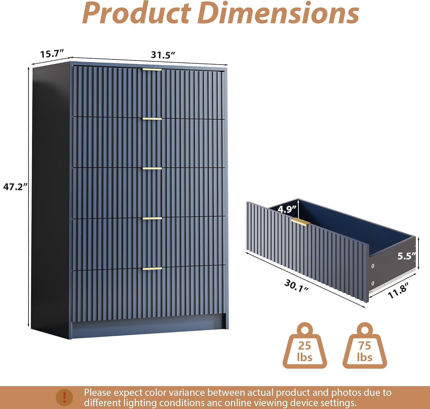 5 Drawer Dresser for Bedroom, Tall Dresser Chest of Drawers with Gold Handles, 32 Inch Wide Nightstand with for Bedroom, Living Rooms, Offices, and Entryways, Navy Blue