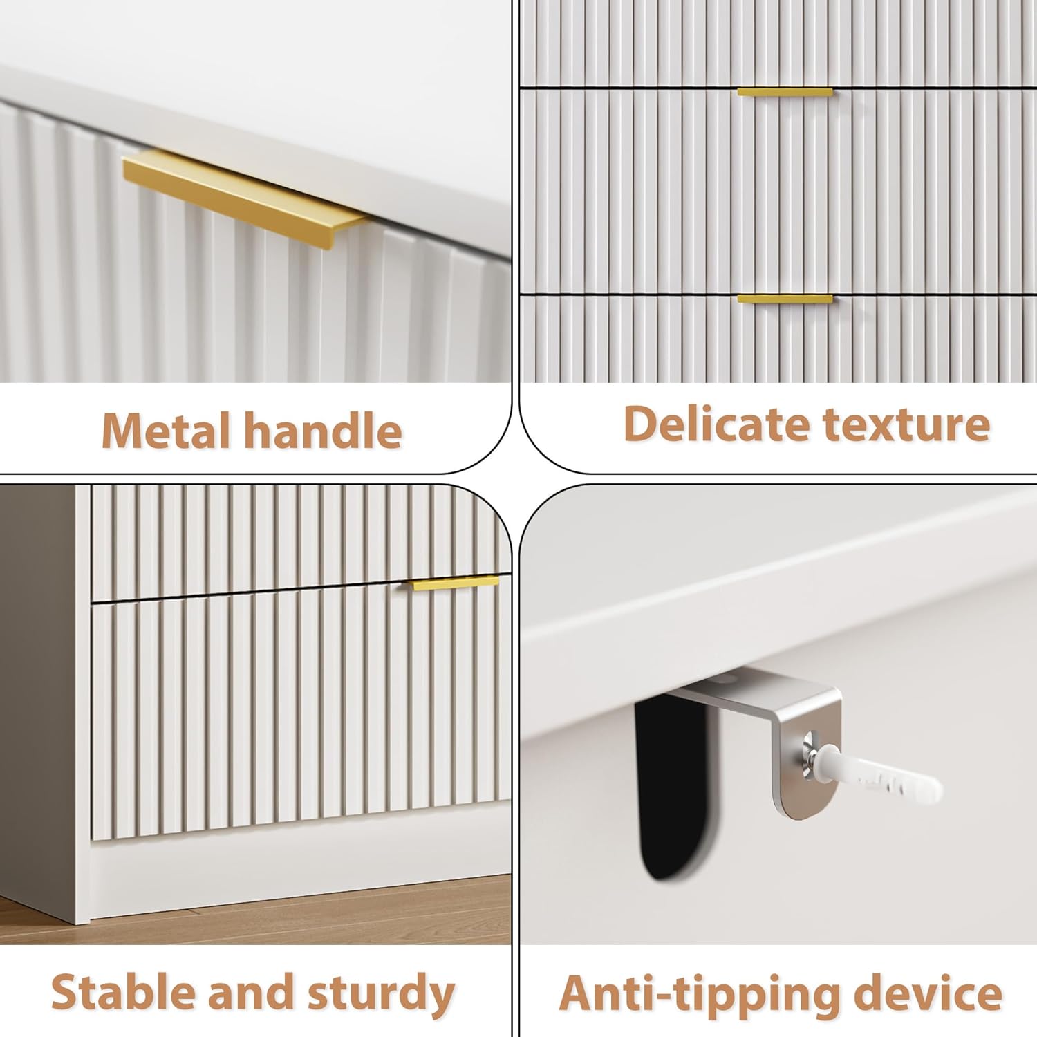 - Safety & Stability: Our fluted dresser features a dual anti-slip design, ensuring drawers stay securely in place, while anti-tipping straps provide added stability. The reinforced base and smooth damping system enhance structural integrity, offering reliable support for everyday storage needs.