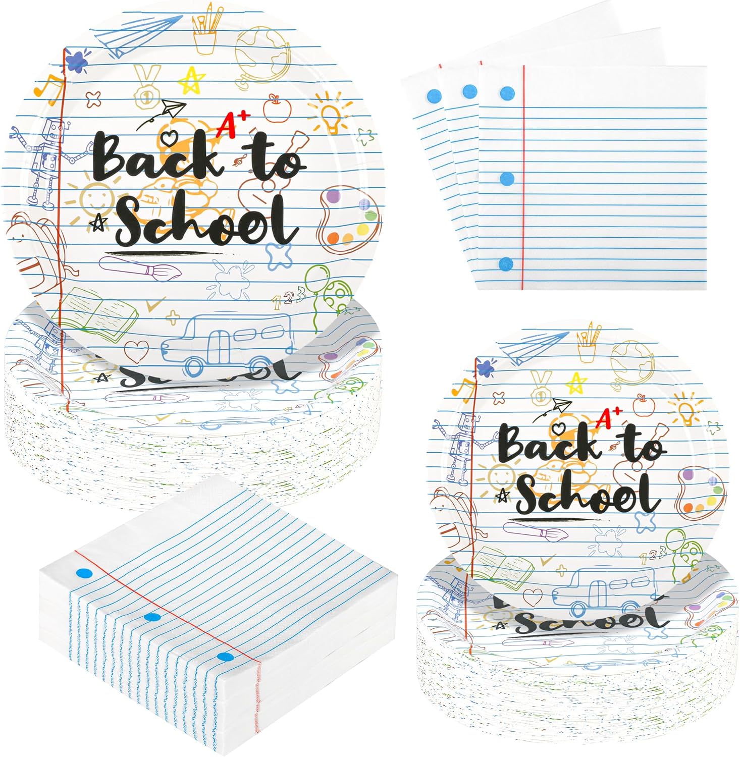 - Included Components : 6.5" notebook napkins *50, 7" school themed plates* 50, 9" back to school paper plates* 50 6.5" notebook napkins *50, 7" school themed plates* 50, 9" back to school paper plates* 50