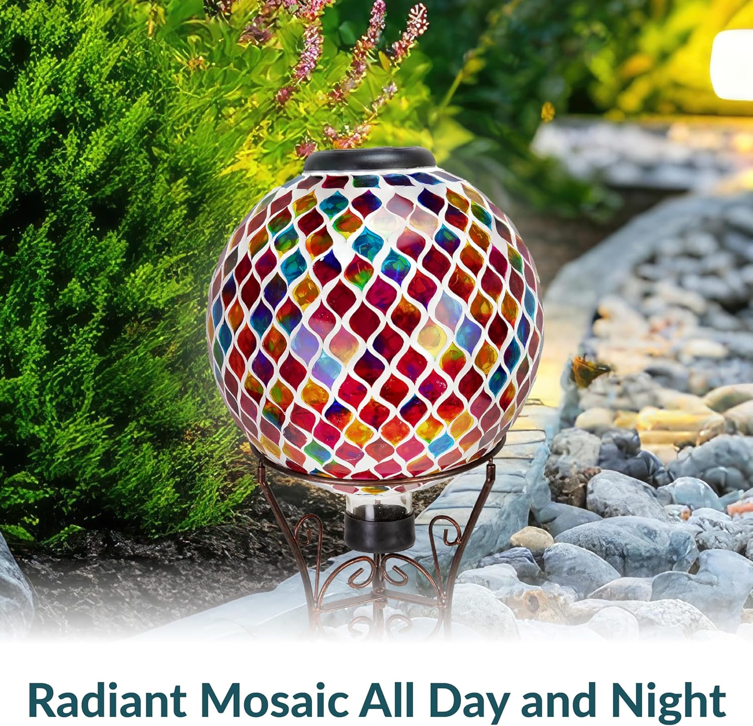 - ADD VIBRANT COLOR TO OUTDOOR SPACES: The gazing globe ball is made from glass with a unique mosaic design. Several beautiful shades will add style to the garden, on the patio, or in flower beds.