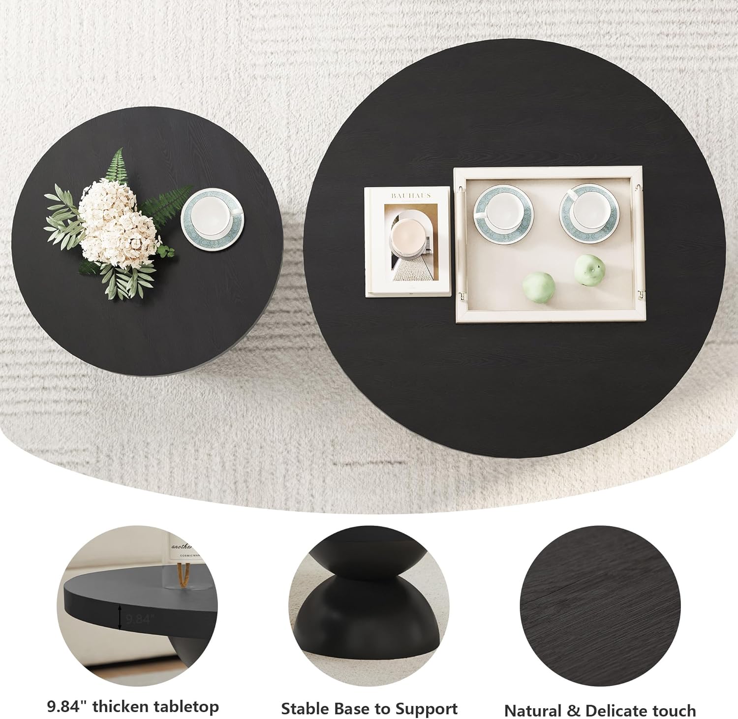 - ăFunctional & FlexibleăUse the larger table as a coffee table centerpiece and the smaller one as a side table or end table next to your sofa or bed. Their neutral finish blends effortlessly with Scandinavian, Japandi, and mid-century modern interiors.