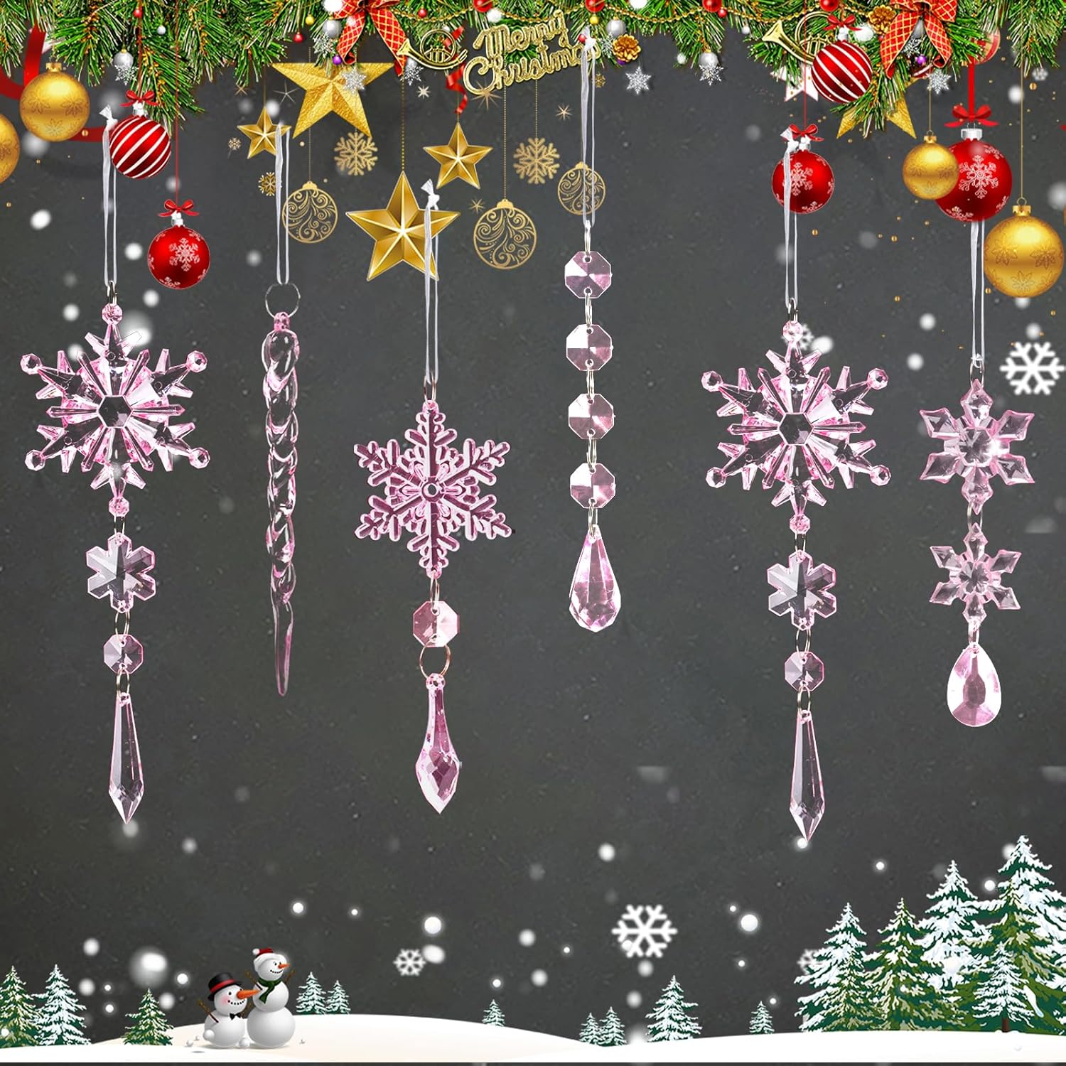 • Package: You will receive a great value pack of 32 pieces pink acrylic Christmas ornaments set in 5 styles, including 12pcs unique designed snowflakes hanging ornaments (5.2", 5.3" and 7.64"), 10pcs 5.3" crystal icicles ornaments and 10pcs 5" bead garlands