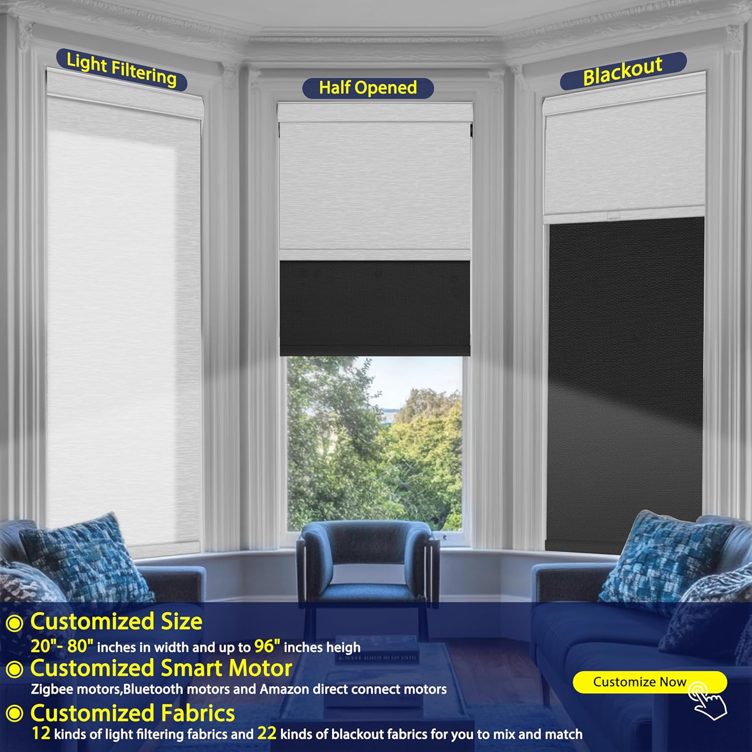 - 【Customized Services】【Customized Fabrics】There are 22 types of blackout fabrics and 12 types of light filtering fabrics, including jacquard fabrics and linen fabrics.【Customized Motors】 there are 3 kinds of smart motors for your choice. You can also choose the size,installation method,the left and right position of the motor,the way of fabric roll-up, whether you need solar panel, etc. according to your actual use requirements.