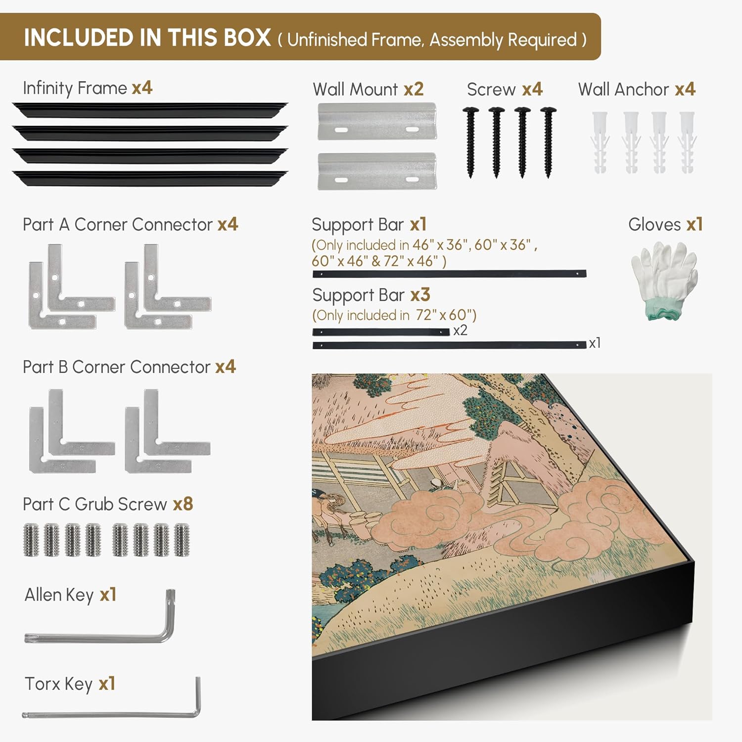 - Assembly Required: The artwork comes with the frame components unassembled. Don’t worry — setup is straightforward and tool-friendly. For best results and accurate alignment, we recommend two people to ensure a smooth assembly and a stable, secure wall mount.