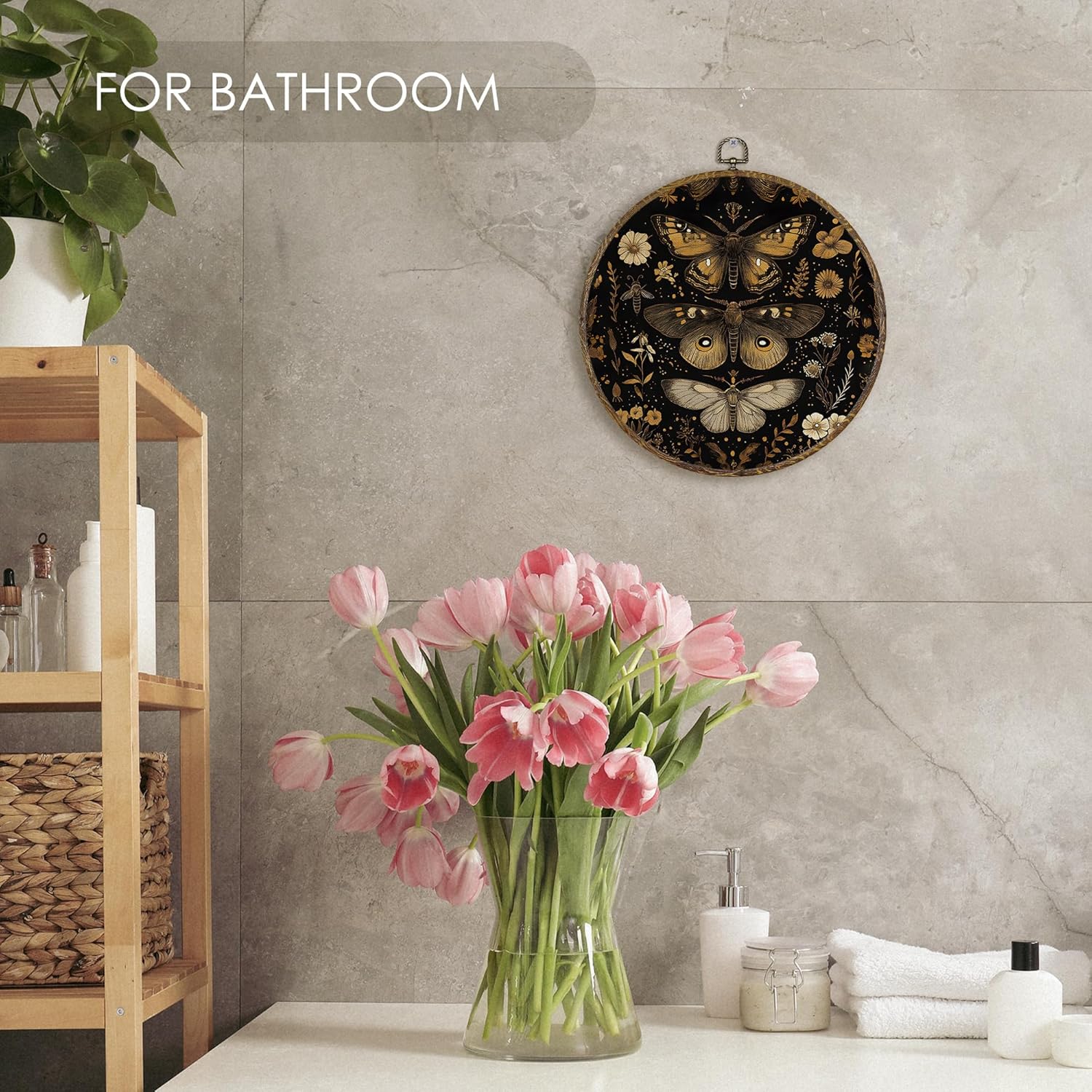 Fewgb Black Gothic Moth Round Wall Art Decor Framed for Gallery Bedroom Living Room Bathroom, Dark Witchy Butterfly Flower Canvas Wall Art Prints Picture, Moody Floral Hanging Room Decor Artwork 10x10