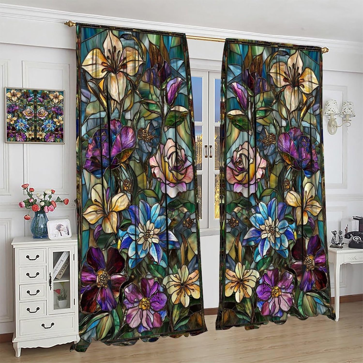 Stained Glass Curtains,Retro Colored Glass Flowers Art Home Decor Drapes for Bedroom Living Room Kitchen Window Treatment 2 Panels Set Total Size 42" W X 63" L Inch