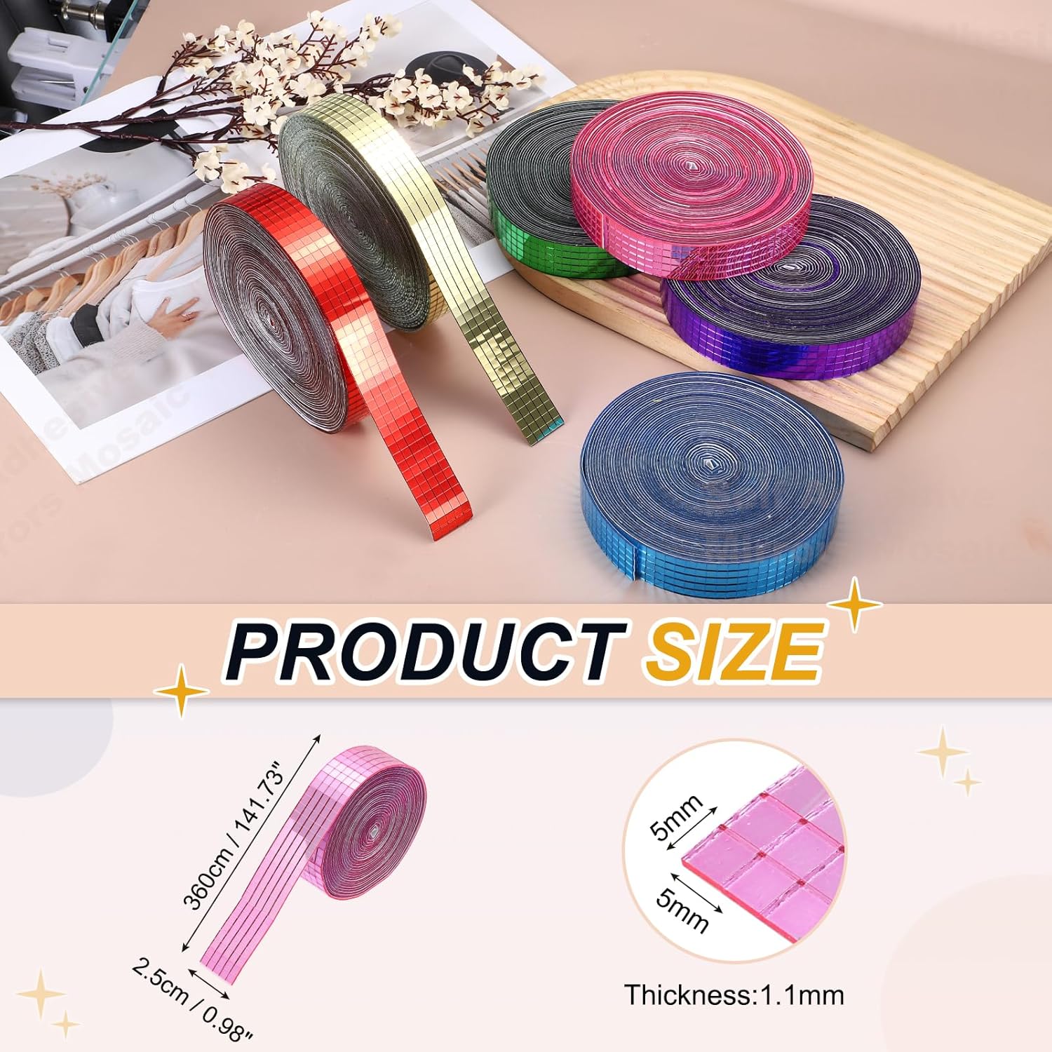 - Specification: Color: Pink; Material: Glass; Size:360x2.5cm/141.73x0.98Inch(LxW); Thickness:1.1mm/0.04inch; Each Tile Size: 5x5mm/0.2x0.2inch; Packing List: 3600 Pcs x Self Adhesive Mirrors Mosaic Tiles (Roll of 1)