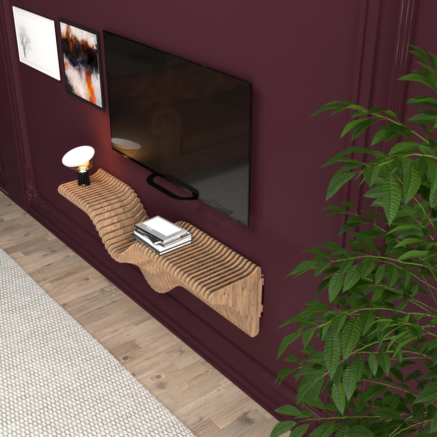 - Batamex 40" Wavy Floating Shelf – Where modern design meets everyday versatility. This sculptural teak-finished piece effortlessly transforms from a sleek TV stand to a floating display shelf or console table, adapting to your needs. The mesmerizing 3D wave pattern (100cm/40inch) makes a bold statement while offering practical storage.