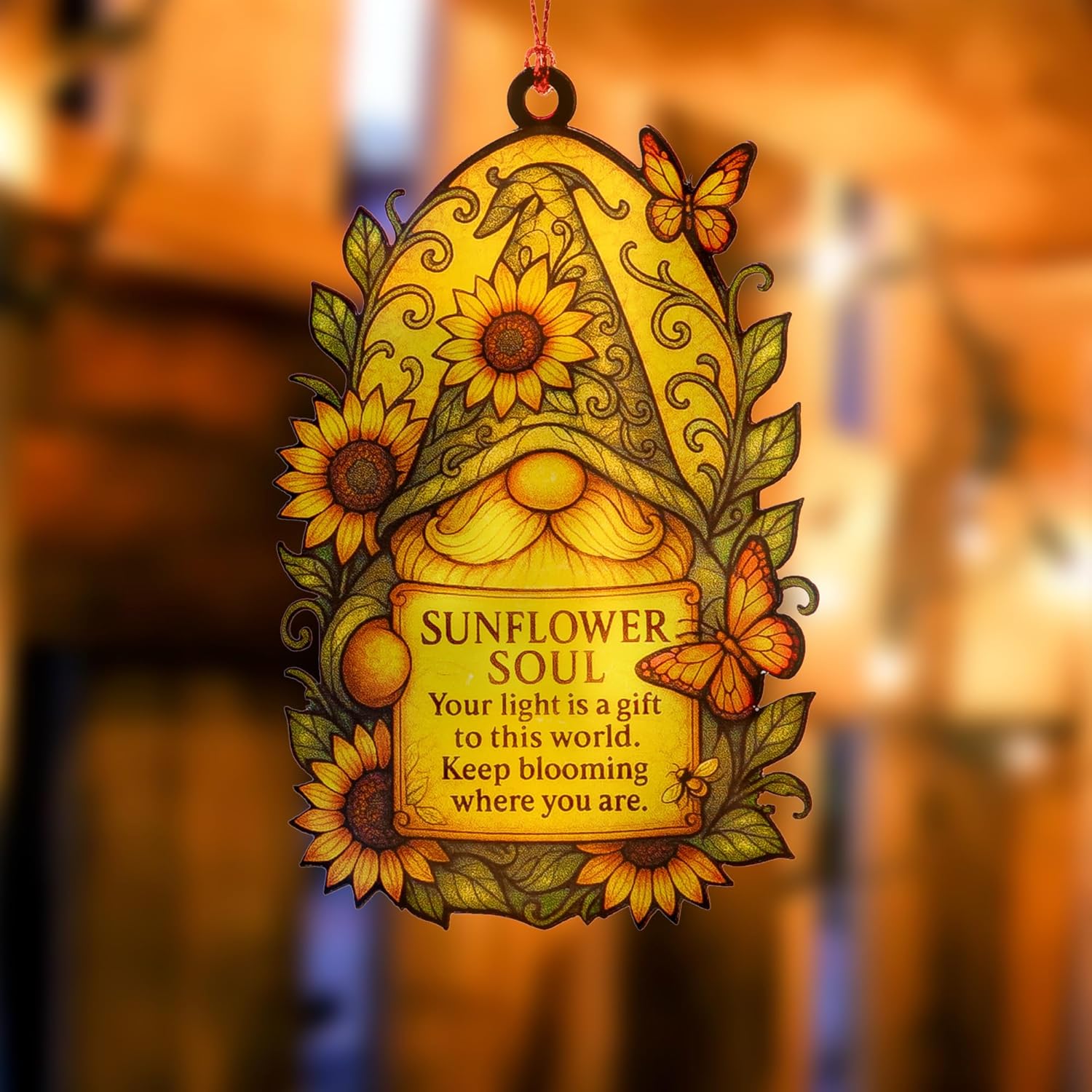 Sunflower Soul Gnome Ornament – Positive Encouragement | Bloom with Light – Butterfly – Uplifting Gift Card [Inspiration Ornament] – Suncatcher Effect Stained Glass Window – Car Hanging