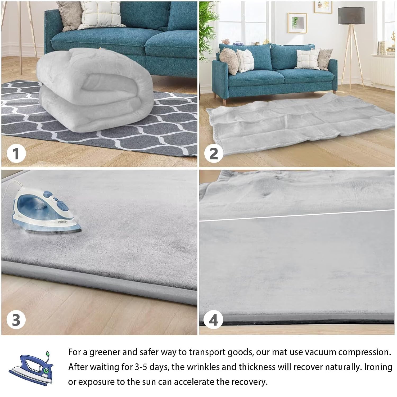 - 🌟HOW TO CARE FOR YOUR MAT:When you open the package,it may be wrinkled,very flat and inelastic.Don’t fret - this is normal! As long as it is left for 3-5 days, the mat will naturally regain its thickness and elasticity. we recommend steaming or ironing it to speed up recovery. After you have completed the steaming/ironing, your thick floor padded mat should rebound and be ready to use!