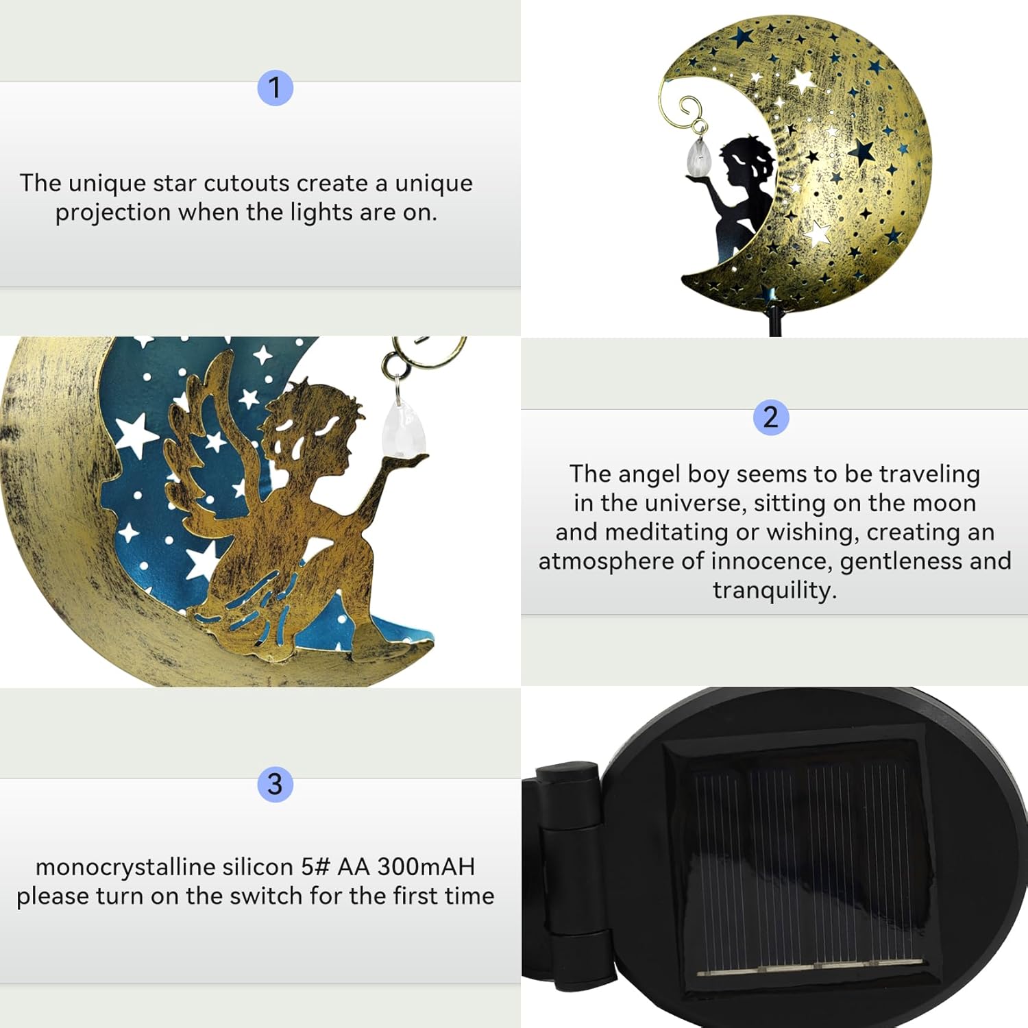 - Unique Celestial Design: The solar garden stake light features a serene angel resting on a crescent moon, surrounded by twinkling stars and a crystal pendant in hand, symbolizing peace, hope, and spiritual light; it adds a spiritual touch to your garden