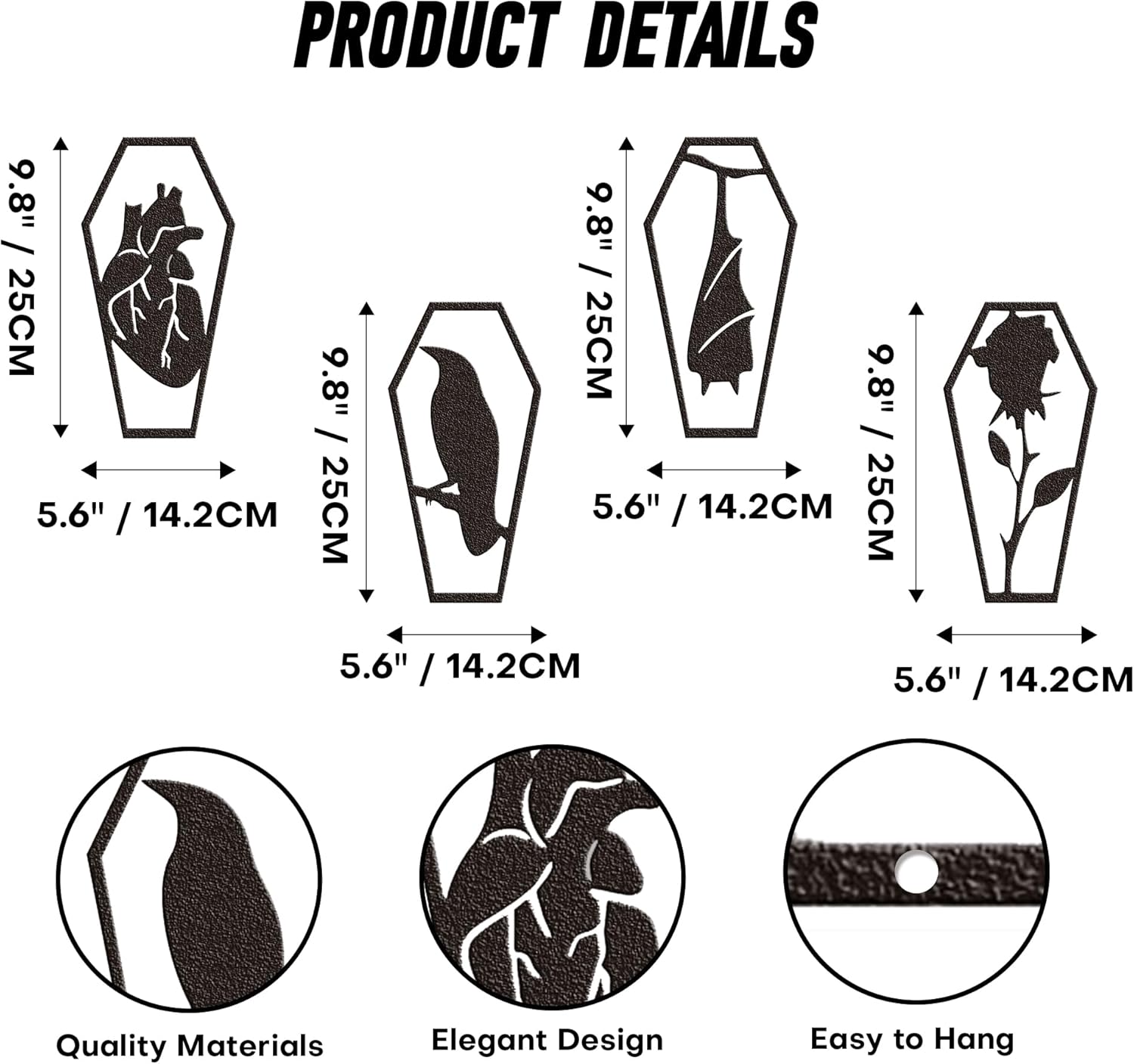 YATEASLU Gothic Coffin Wall Decor Set of 4 Metal Heart, Crow, Bat, Rose Sculptures for Gothic Home Decor, Bathroom, Kitchen, Office - Spooky Halloween Wall Decor with Screws