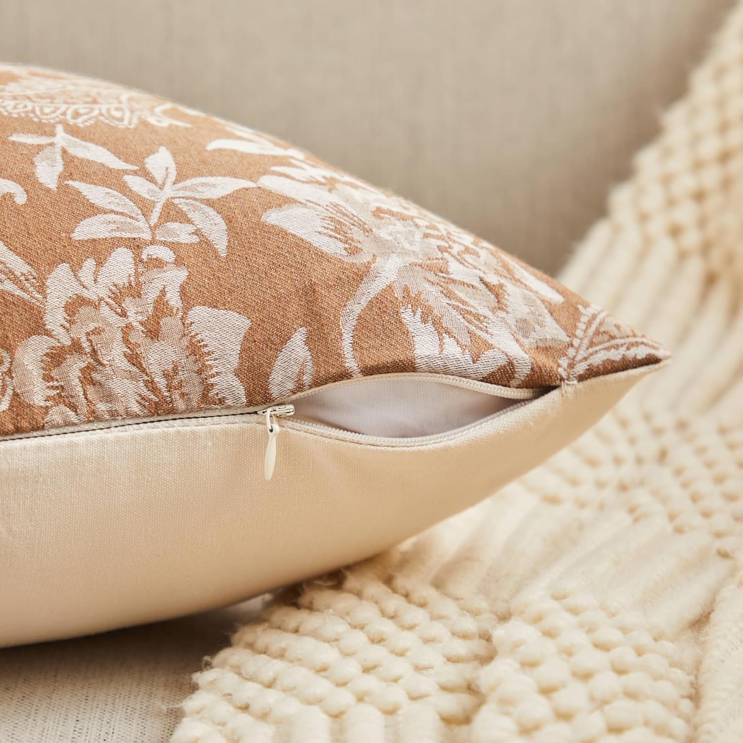 Floral Jacquard Throw Pillow Covers Set of 2, Background/Caramal 18x18 Inch, Farmhouse Decorative Cotton Caramal Cushion Covers for Sofa Bed Living Room Home Decor