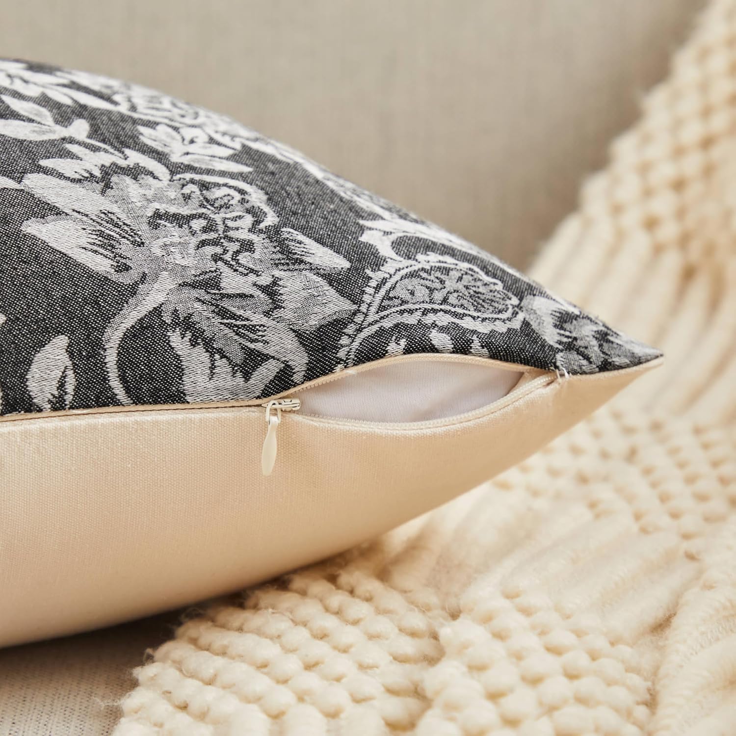 Floral Jacquard Throw Pillow Covers Set of 2, Background/Charcoal 18x18 Inch, Farmhouse Decorative Cotton Dark Grey Cushion Covers for Sofa Bed Living Room Home Decor
