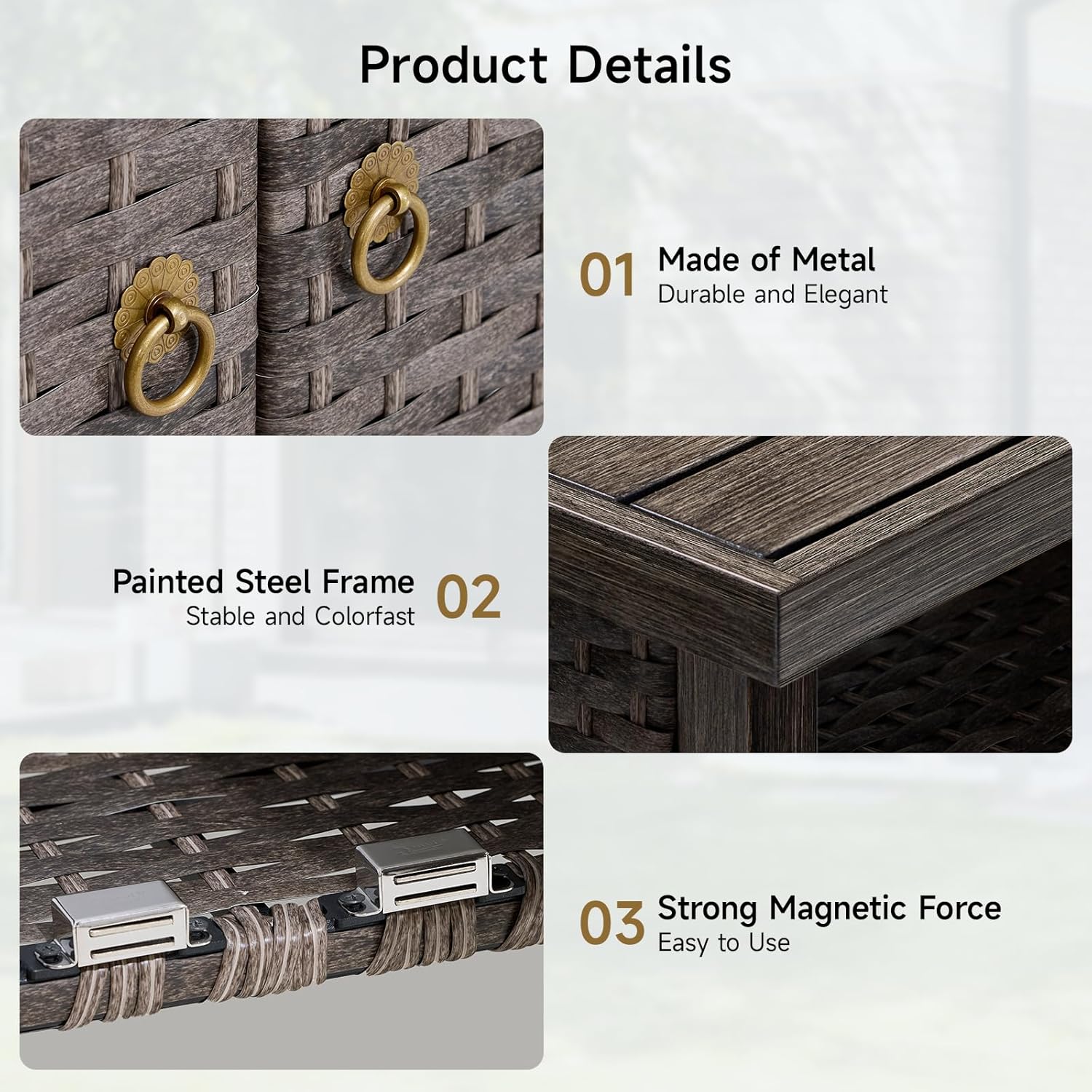 - Weatherproof Materials: Rain or shine, this patio cabinet stays elegant! Handwoven PE rattan brings nice texture that resists cracking, paired with a painted steel frame that resist rust and sunburn. Whether on a sunny patio or in a humid environment, rotting and fading are no more. Tough enough for outdoors, chic enough for indoors!