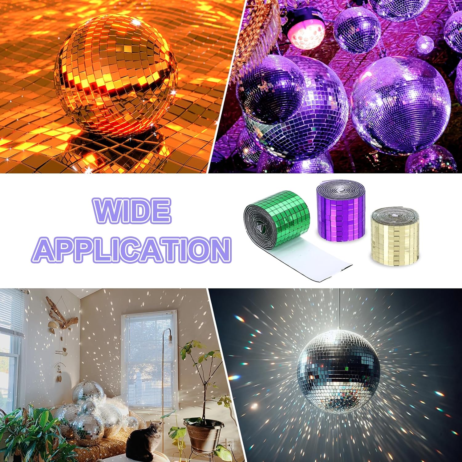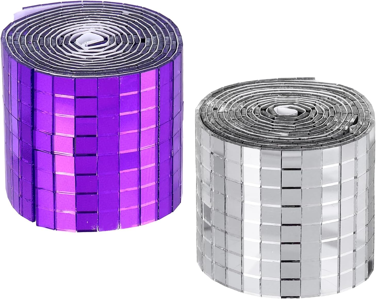 - we provide here, are in the size of: Size: Each roll measures 4 x 100cm (total 2 meters) ; Material: glass with strong adhesive backing ; Color: 1 roll of Purple + 1 roll of Silver (total 2 rolls) ; In the package of: 3200 Pieces Adhesive Mosaic Tiles 5 x 5 mm Disco Tiles 2 Rolls (Purple & Silver)