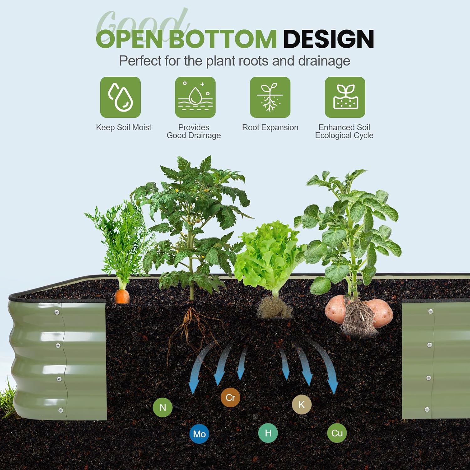 - Root-Friendly Drainage: Open-bottom design prevents waterlogging and root rot while promoting nutrient absorption. Made with galvanized materials to protect soil integrity, ensuring healthy growth of vegetables, herbs, flowers, and fruits