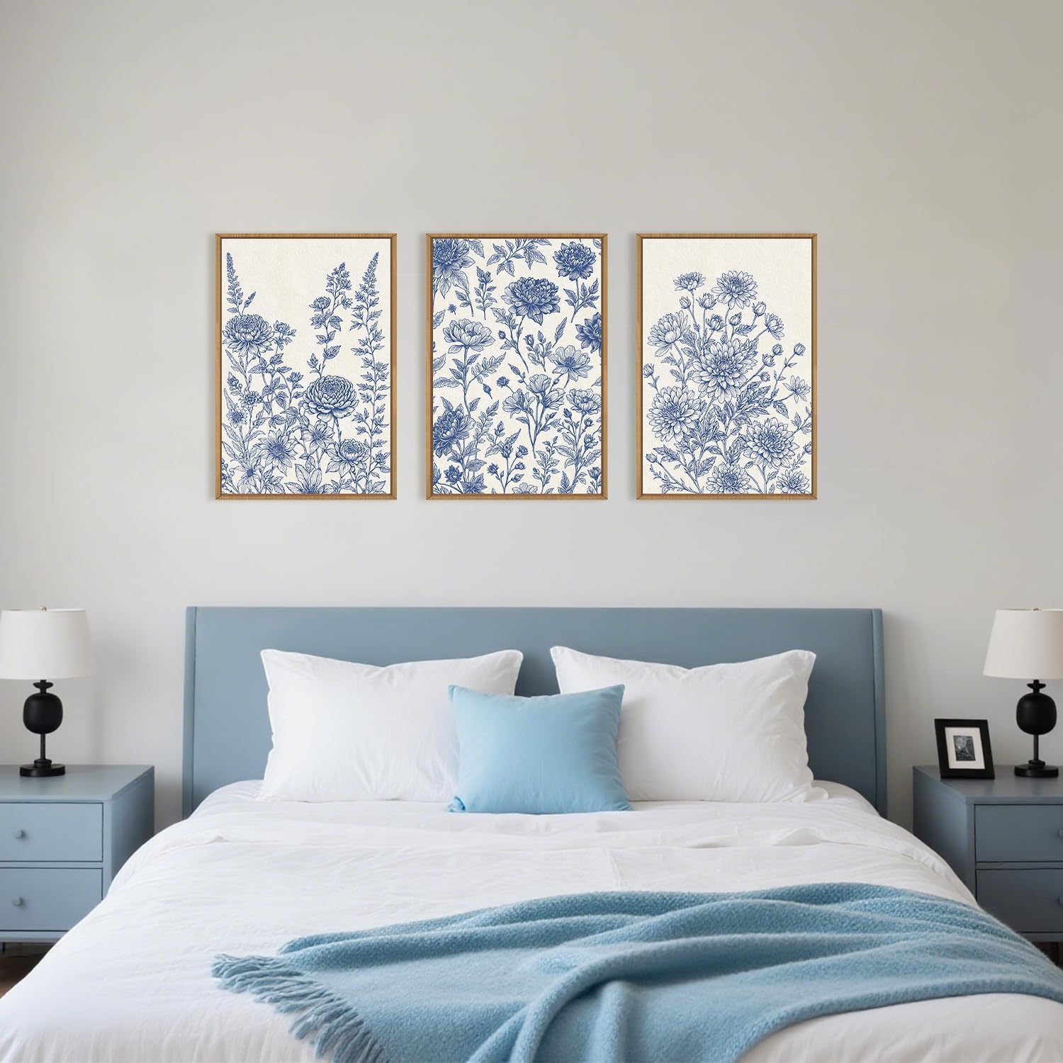 Classic Chinoiserie Floral Framed Canvas Wall Art Set, Blue and White Flower Wall Decor, Navy Watercolor Wall Painting, Minimalist Wildflower Art Print for Living Room, Bedroom - 16"x24"×3