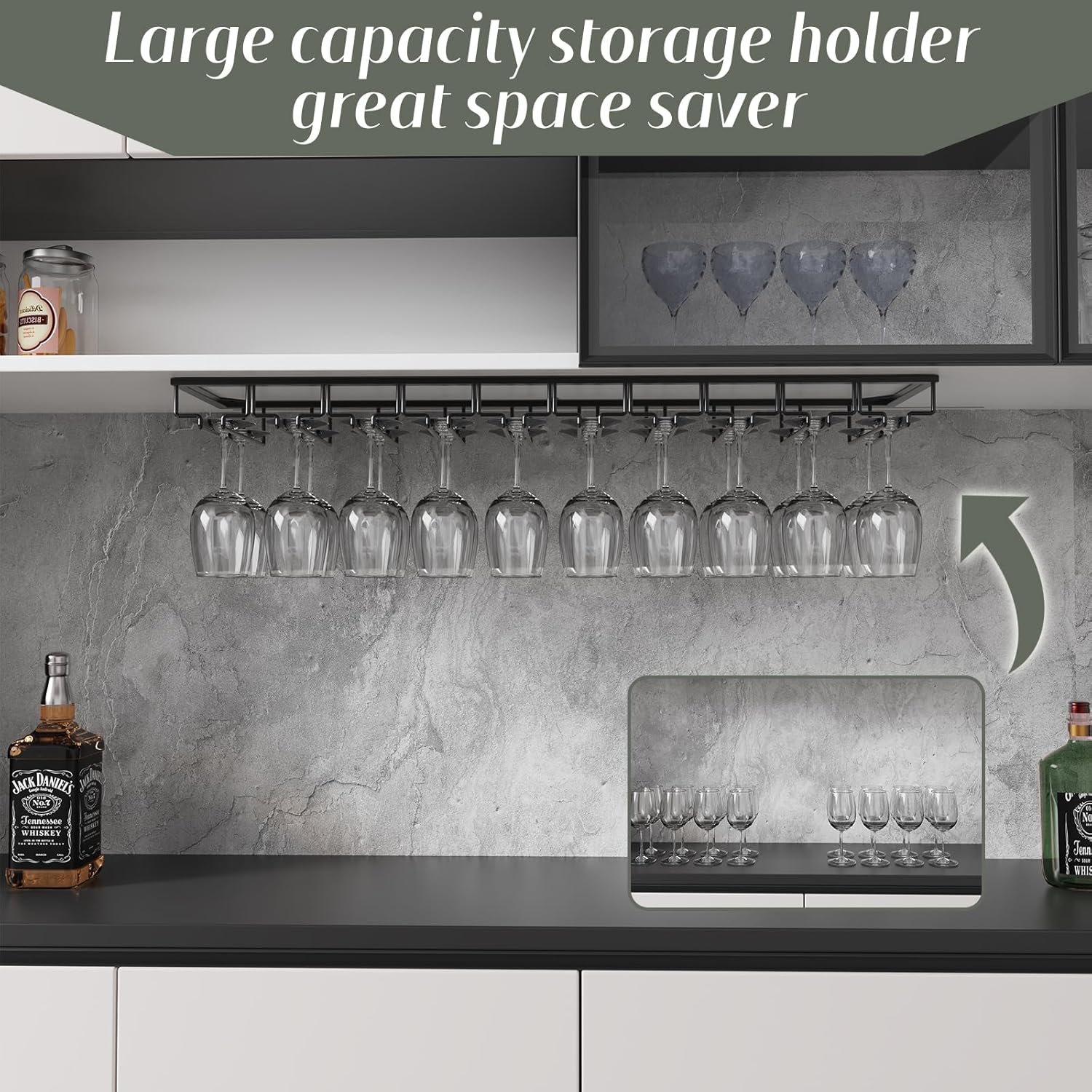 - [Durable and Rustproof] - This glasses hanger rack is made of high-quality iron with black coating,sturdy enough,increasing durability of this rack and prevent the rack from oxidizing and rusting.There is no worry about affecting beauty of your kitchen or bar .This rack is beautiful,useful,easy to clean and service for a long life time.