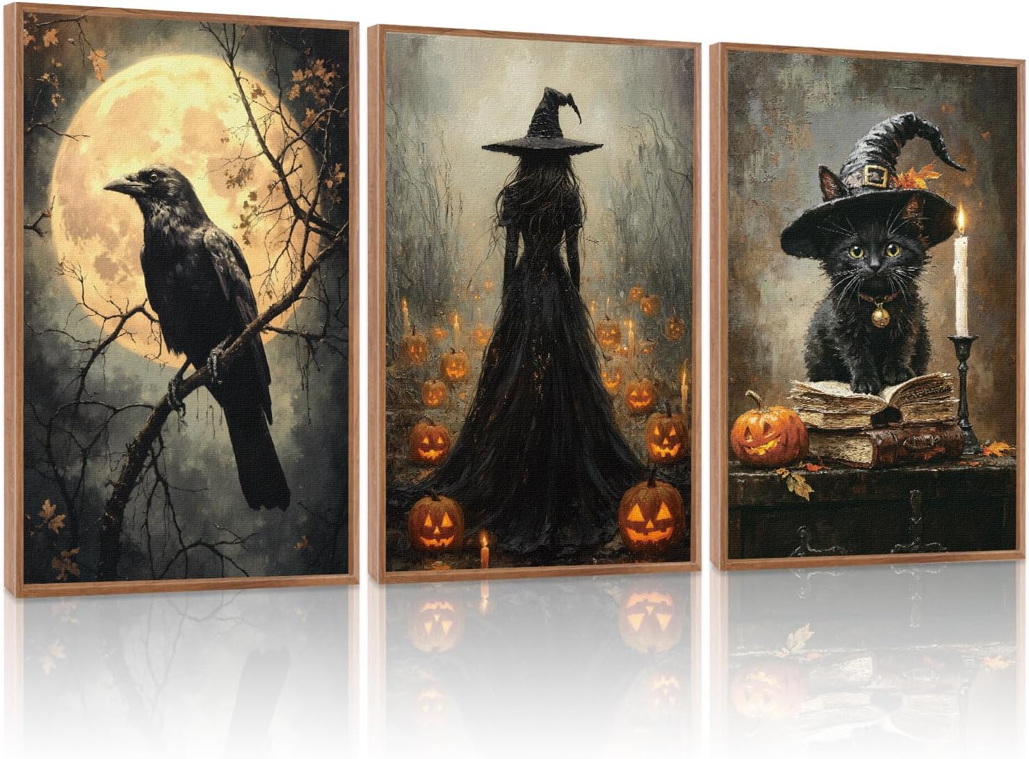 KAIRNE Framed Halloween Canvas Wall Art,Dark Witch Crow Prints,Black Cat Painting,Horror Gothic Pictures Set of 3 (16”X24”),Scary Halloween Wall Decor for Party Living Room Bedroom Office Decoration