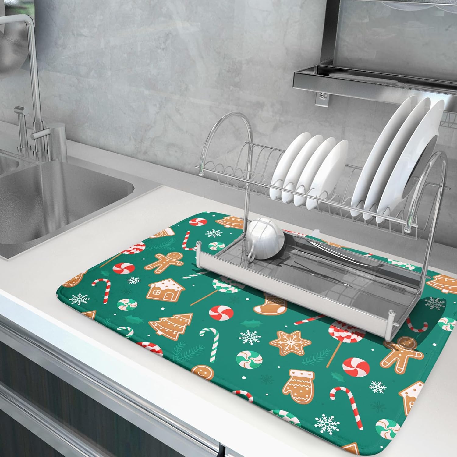 Gingerbread Dish Drying Mat for Kitchen Counter Holiday Green Super Absorbent Reversible Microfiber Kitchen Countertop Protector Dishes Pad Large 18x24 inch