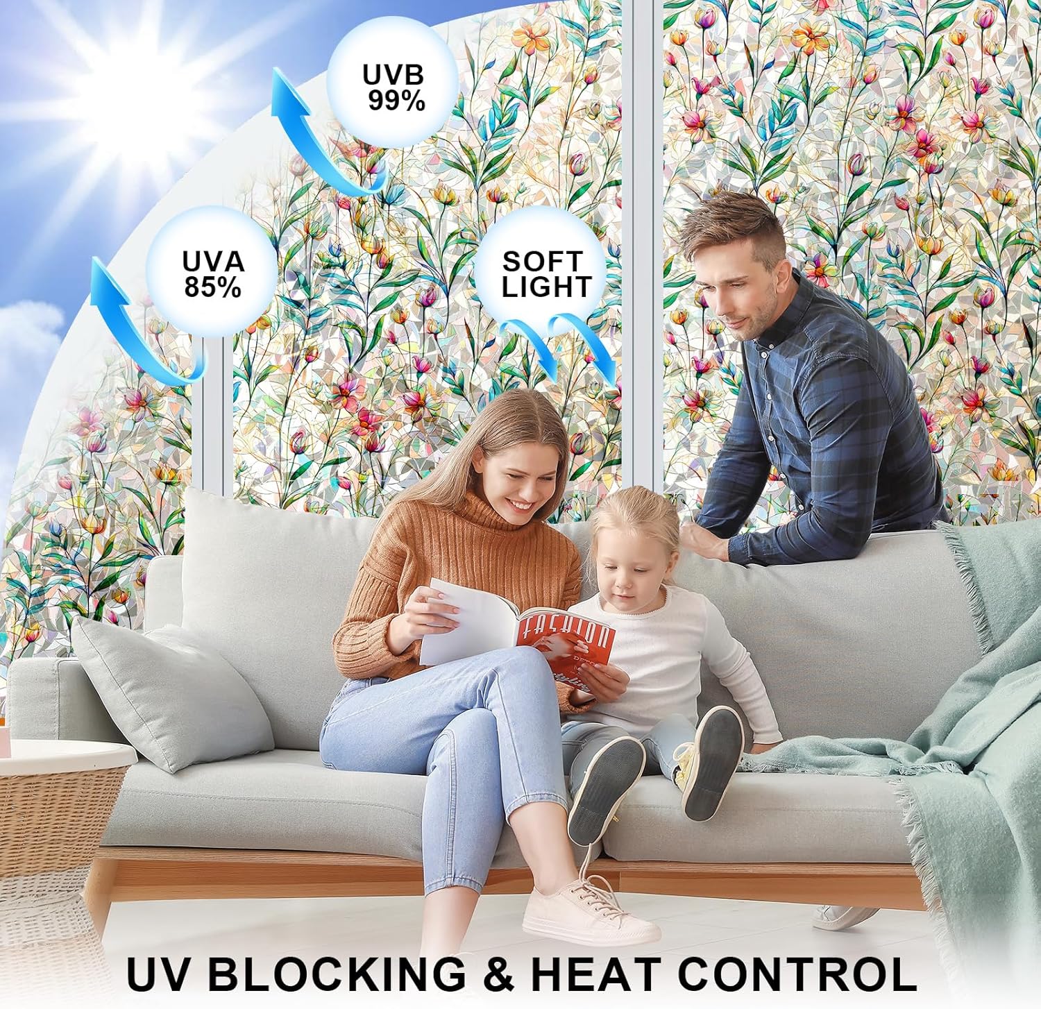 Rainbow Window Privacy Film 3D Floral Decorative Stained Glass Window Film Anti UV Non-Adhesive Reusable 23.6" x 78.7" for Home Room Car Glass Cling