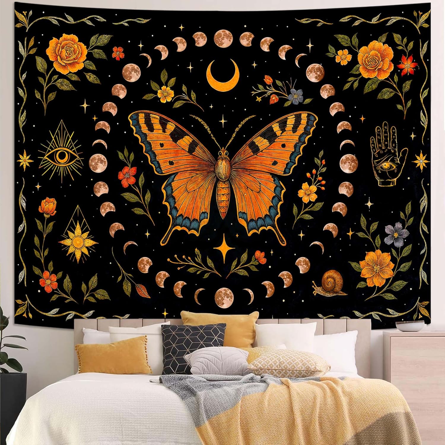 Lunerfex Moon Phase Butterfly Floral Wall Tapestry, Celestial Botanical Tapestries for Room Decor, Mystical Tapestry 80x60 Inch