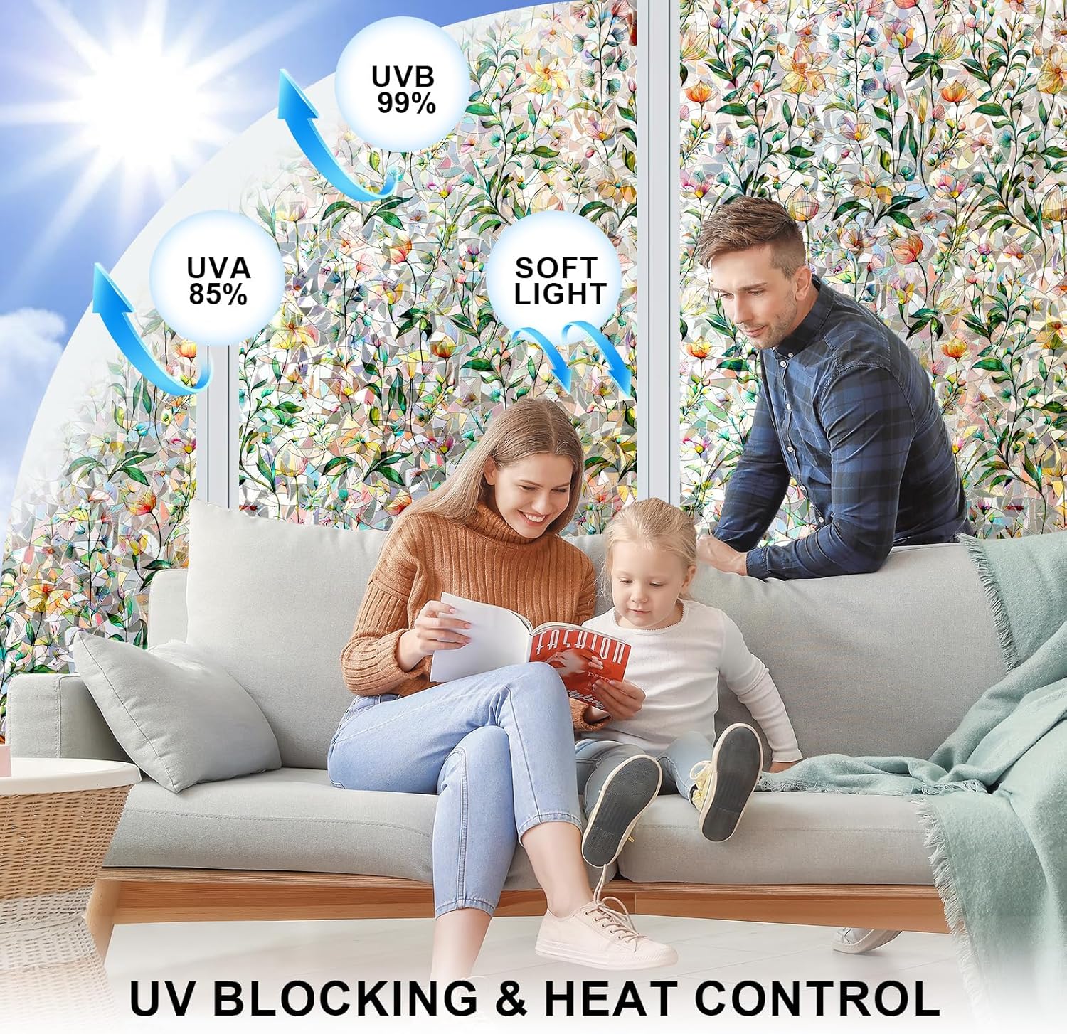 Rainbow Window Privacy Film 3D Floral Decorative Stained Glass Window Film Anti UV Non-Adhesive Reusable 17.5" x 157.4" for Home Room Car Glass Cling
