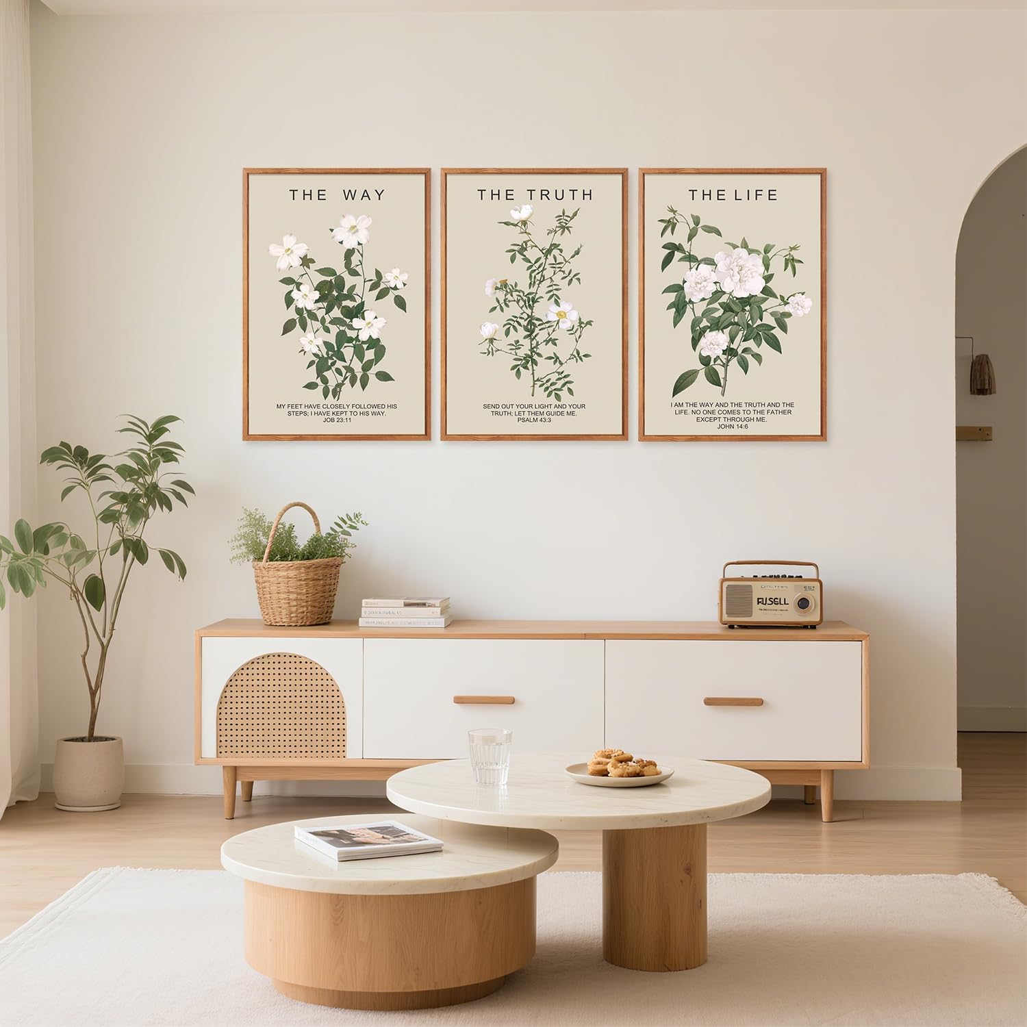 Aurlan The Way The Truth The Life Bible Verse Framed Wall Art(16"x24"), 3PCS Boho Christian Scripture Canvas Artwork, Large Floral Botanical Job 23:11 Psalm 43:3 John 14:6 Decor for Home Bedroom