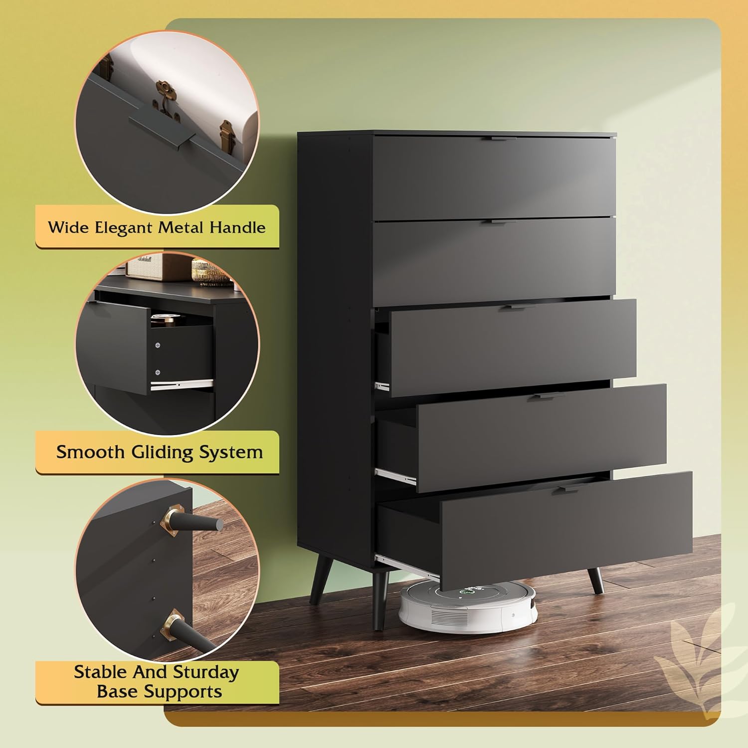 - 🏠【Modern 5 Drawers Dresser】This wooden dresser meets storage needs and is classic and atmospheric. Exquisite handle design, convenient and practical. It can be used for bedroom clothing organizer, entryway table, decorative storage for living room, making your room look cleaner and brighter.