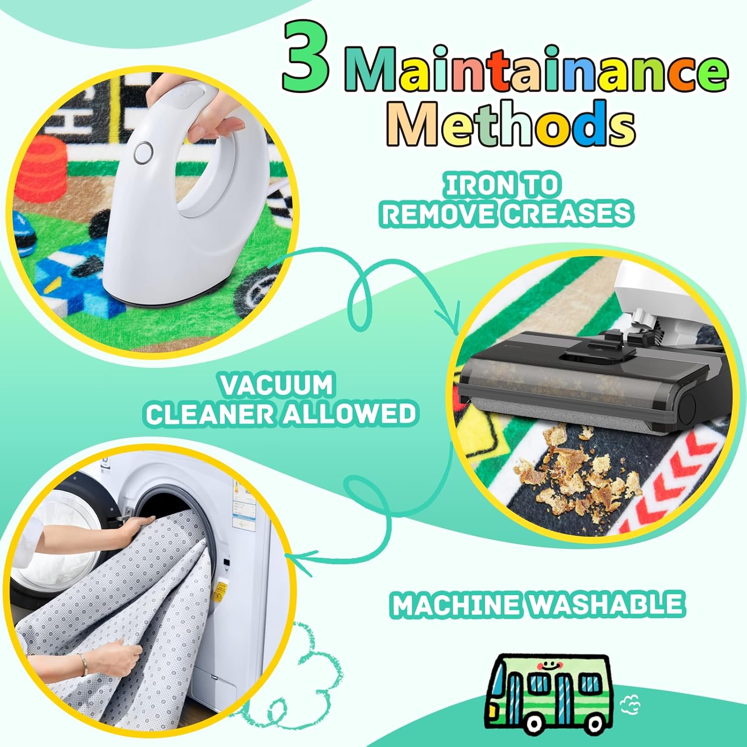 - [Machine Washable Kids Play Rug]: This car rug for kids toy cars measures 6 x 9 feet/72*108 inches. 0.4'' thick. Our mat is easy to clean by vacuum or machine. Perfect bedroom rug, living room rug, and playroom rug
