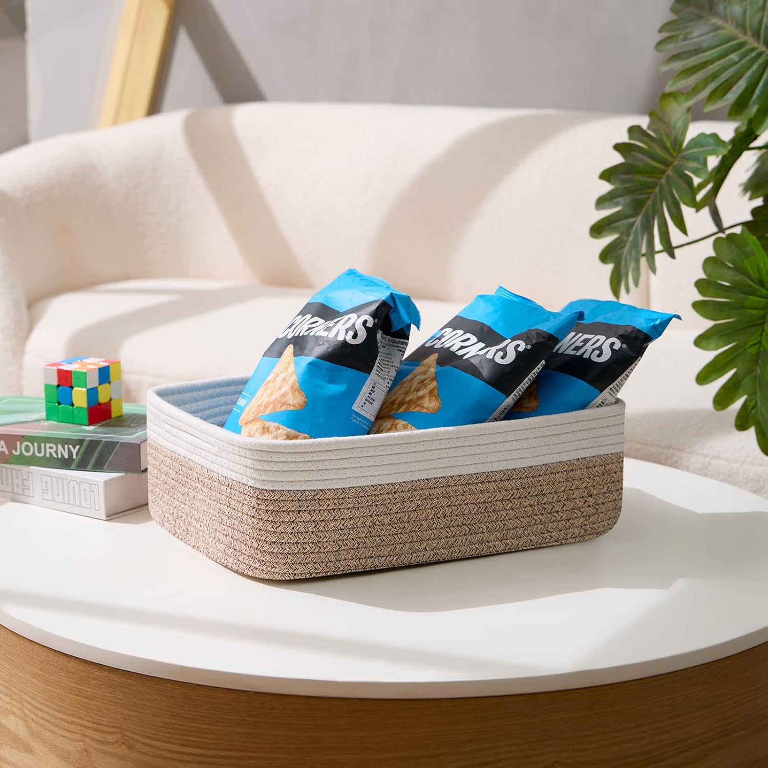 Large Shallow Organizing Baskets 15x11x5.1 Inches - Rope Woven Storage Bins for Bathroom, Shelves, Cube Closet, White Mixed Brown 2 Packs