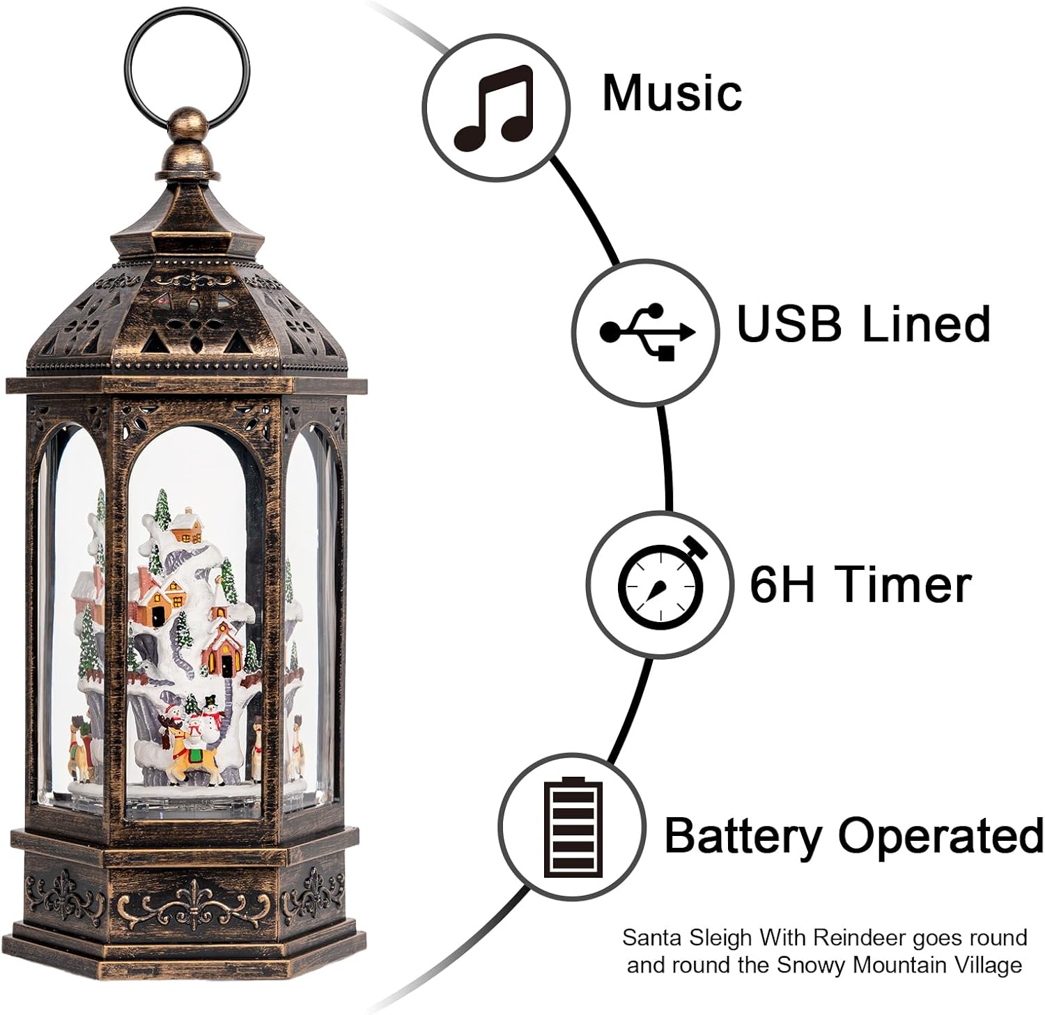 - šć2 Mode Power SupplyćPowered by USB to DC cable (include), the snow globe lantern can be operated without batteries, which can save you a lot on batteries. & Powered by 3 AA batteries (not included), you can place it at any place that you want to add warm ambiance.