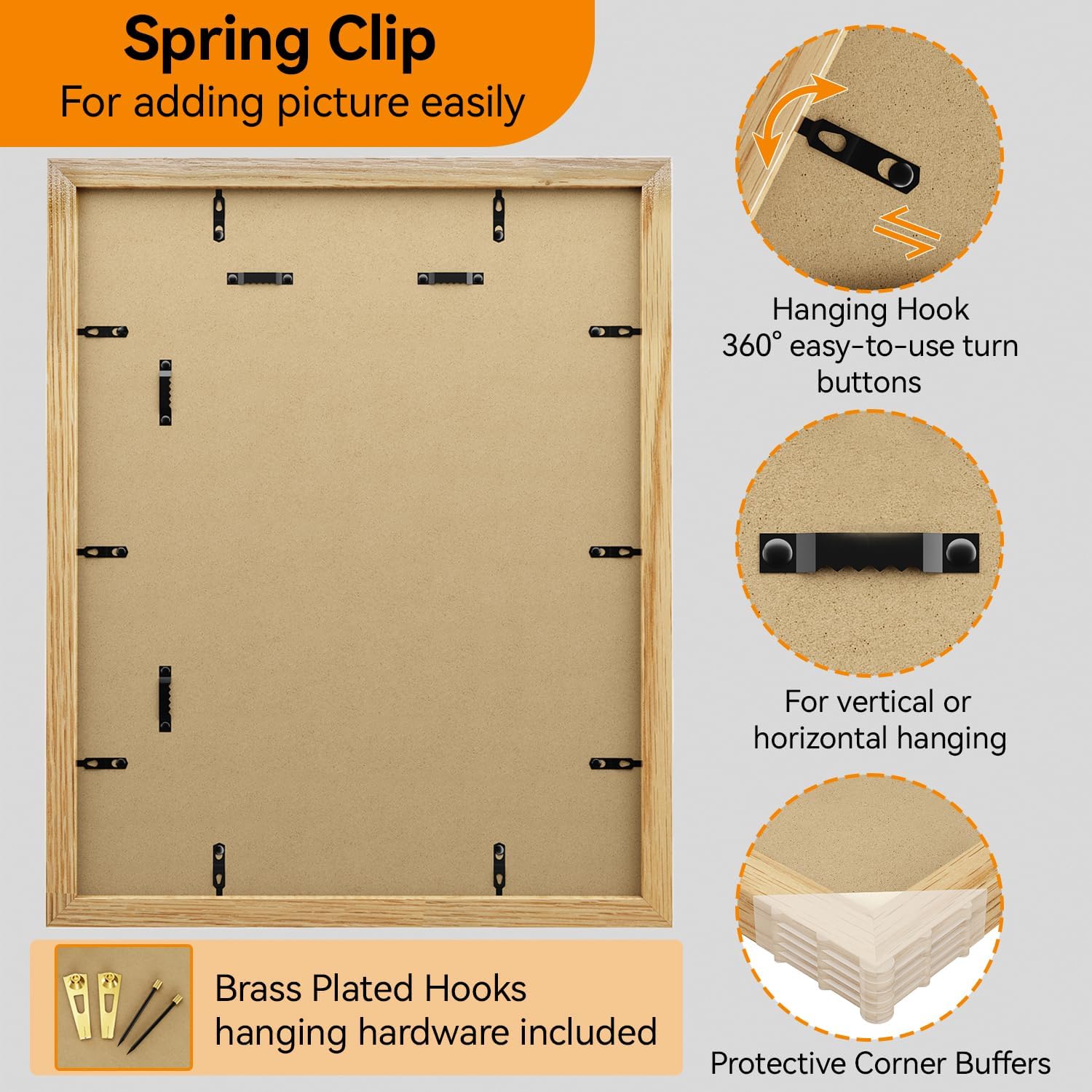 - VERSATILE DISPLAY: Sturdy backboard and versatile hooks allow for horizontal or vertical placement,it creates a cozy atmosphere. Our natural oak poster frames to display your pictures, posters, diplomas and crafts for a stylish home decor.