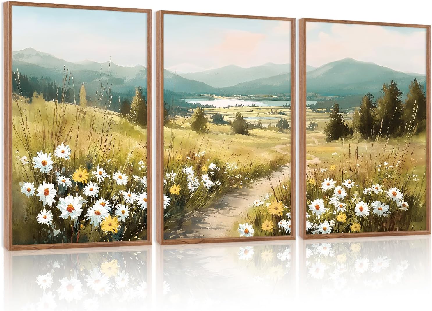 KAIRNE Field Canvas Wall Art,Vintage Landscape Wall Decor,Wildflower Prints Set of 3(16”X24”),Nature Botanical Floral Posters,Rustic Paintings for Kitchen Living Room Bedroom Farmhouse Decor,Framed