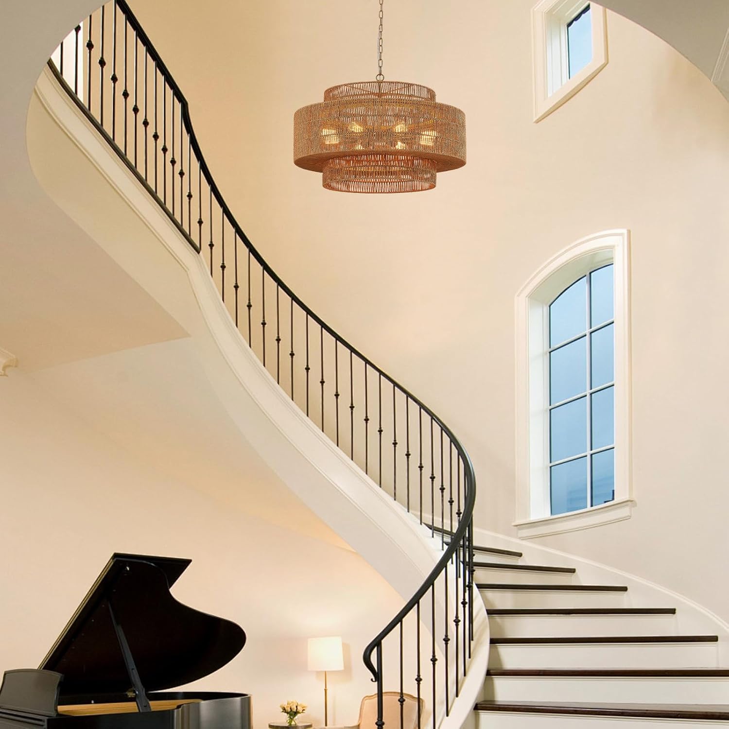 - 【3-Tire Design】The 3-tier rattan chandelier's simple wicker weave and golden finish metal frames bring a vintage bohemian style. This farmhouse chandelier light fixture features three round metal frames that form a captivating semicircular hollow cage. This design sets it apart, adding an element of sophistication.