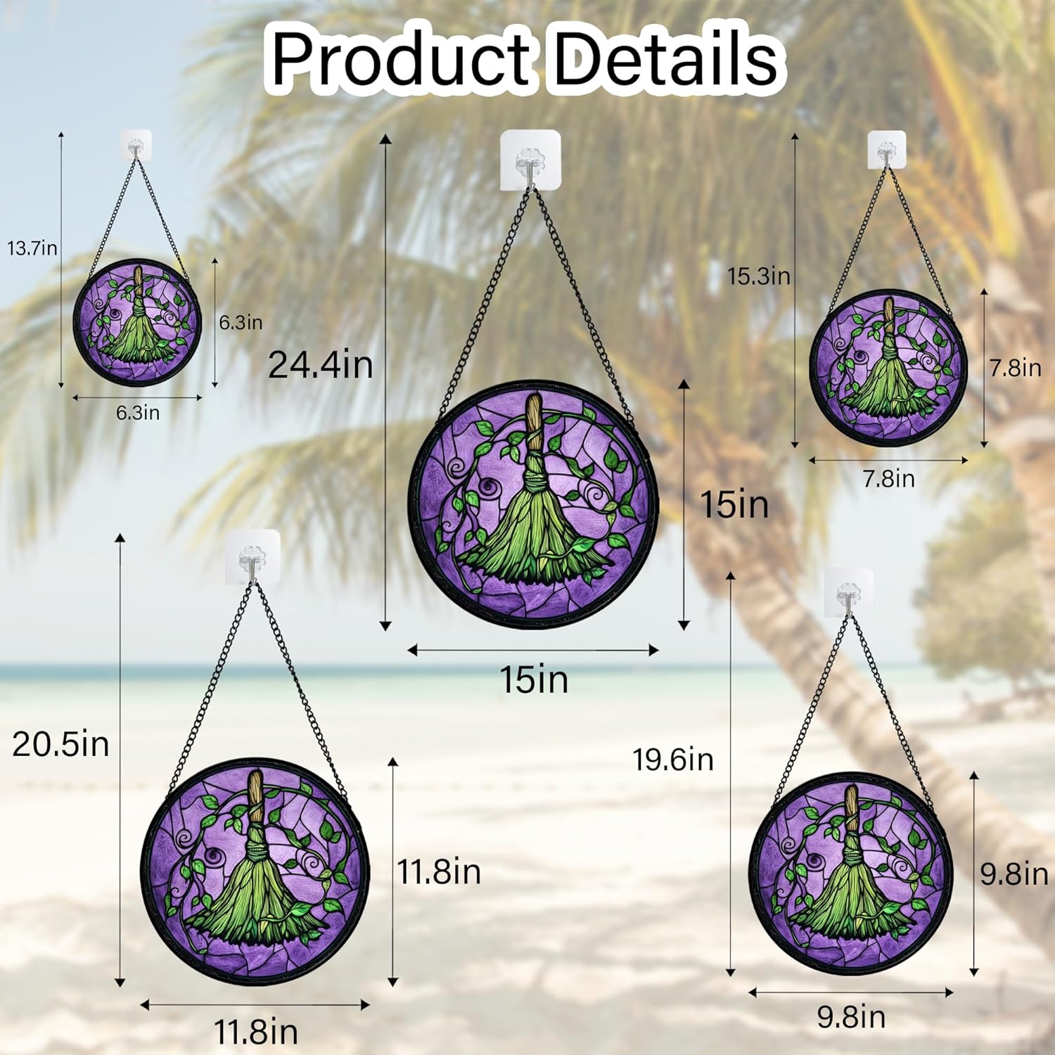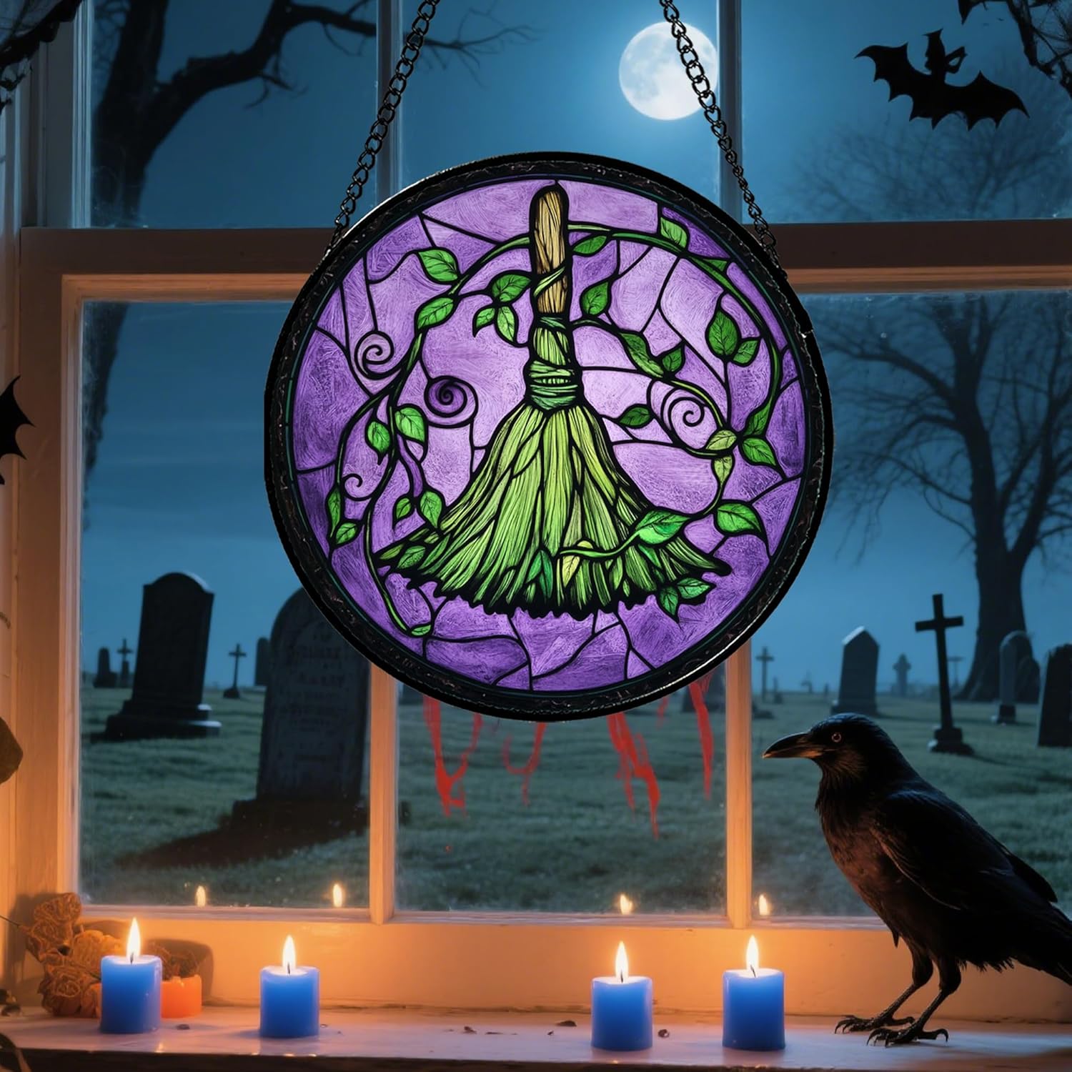Stained Glass Window Hanging - Halloween Decorations Witch Magic Broom Suncatcher for Doors Garden Indoor Funny Spooky Sun Catchers Gothic Decor Horror Gifts for Women Men Friend 7.8 in