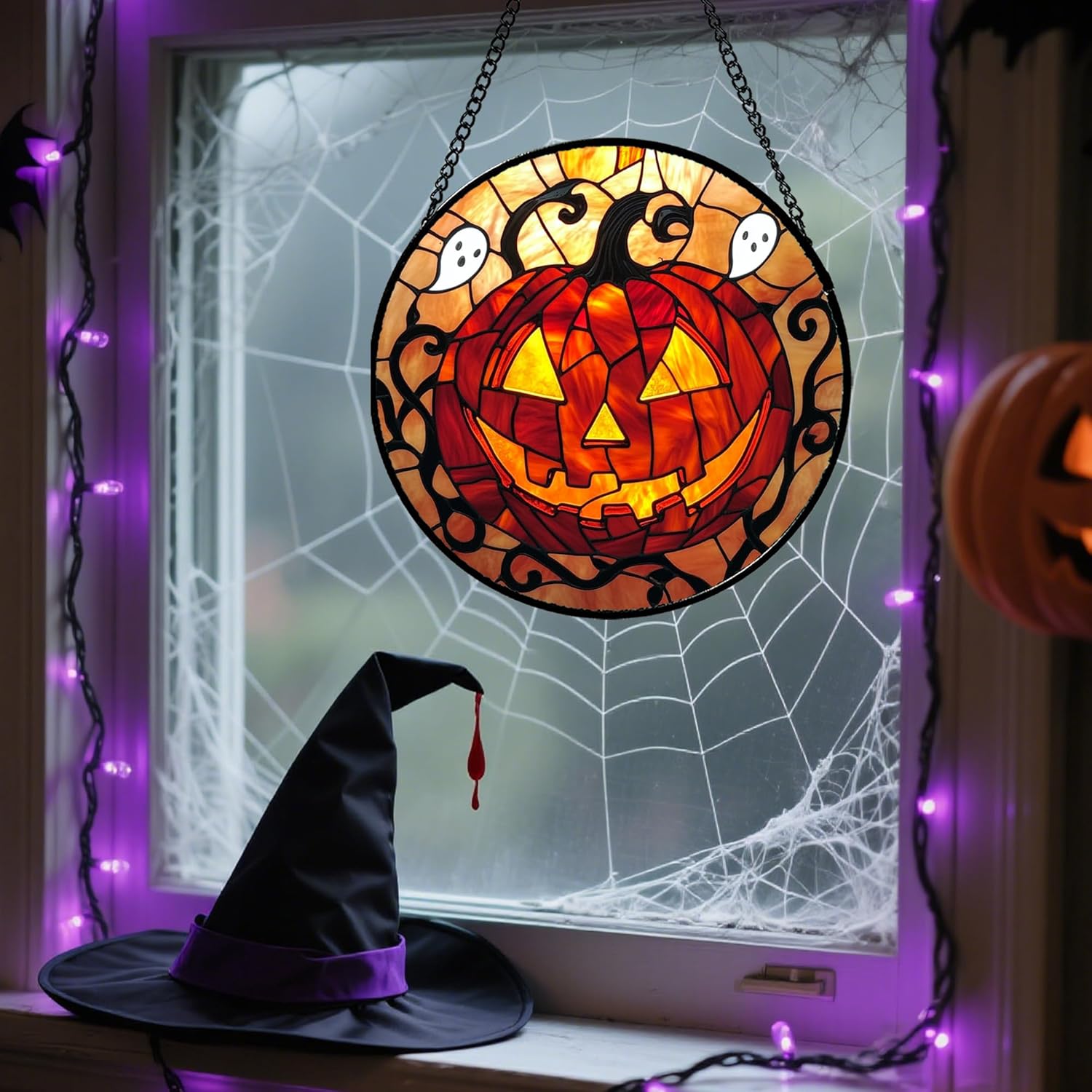 Stained Glass Window Hanging - Halloween Decorations Evil Pumpkin Orange Suncatcher for Doors Garden Indoor Funny Spooky Sun Catchers Gothic Decor Horror Gifts for Women Men Friend 11.8 in