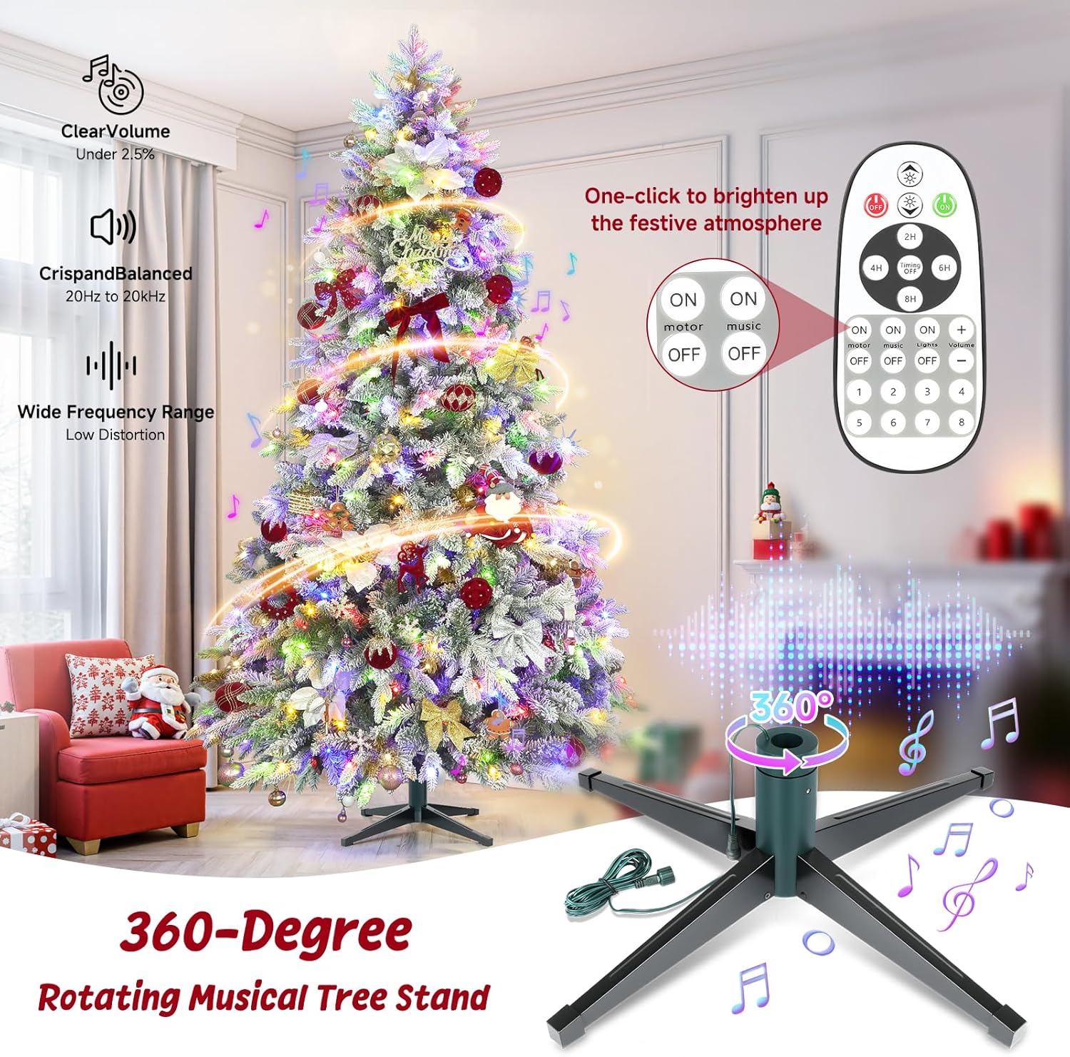 - 360° Rotating Base Built-In Festive Music: Enjoy a mesmerizing display from every angle with our motorized rotating base. The white christmas tree smoothly turns 360 degrees by the remote control, showcasing your ornaments and decorations beautifully without any manual adjustment. Elevate your holiday ambiance with the built-in music feature! The base plays a selection of classic Christmas melodies, filling your home with cheerful tunes that bring extra joy and warmth to your gatherings.