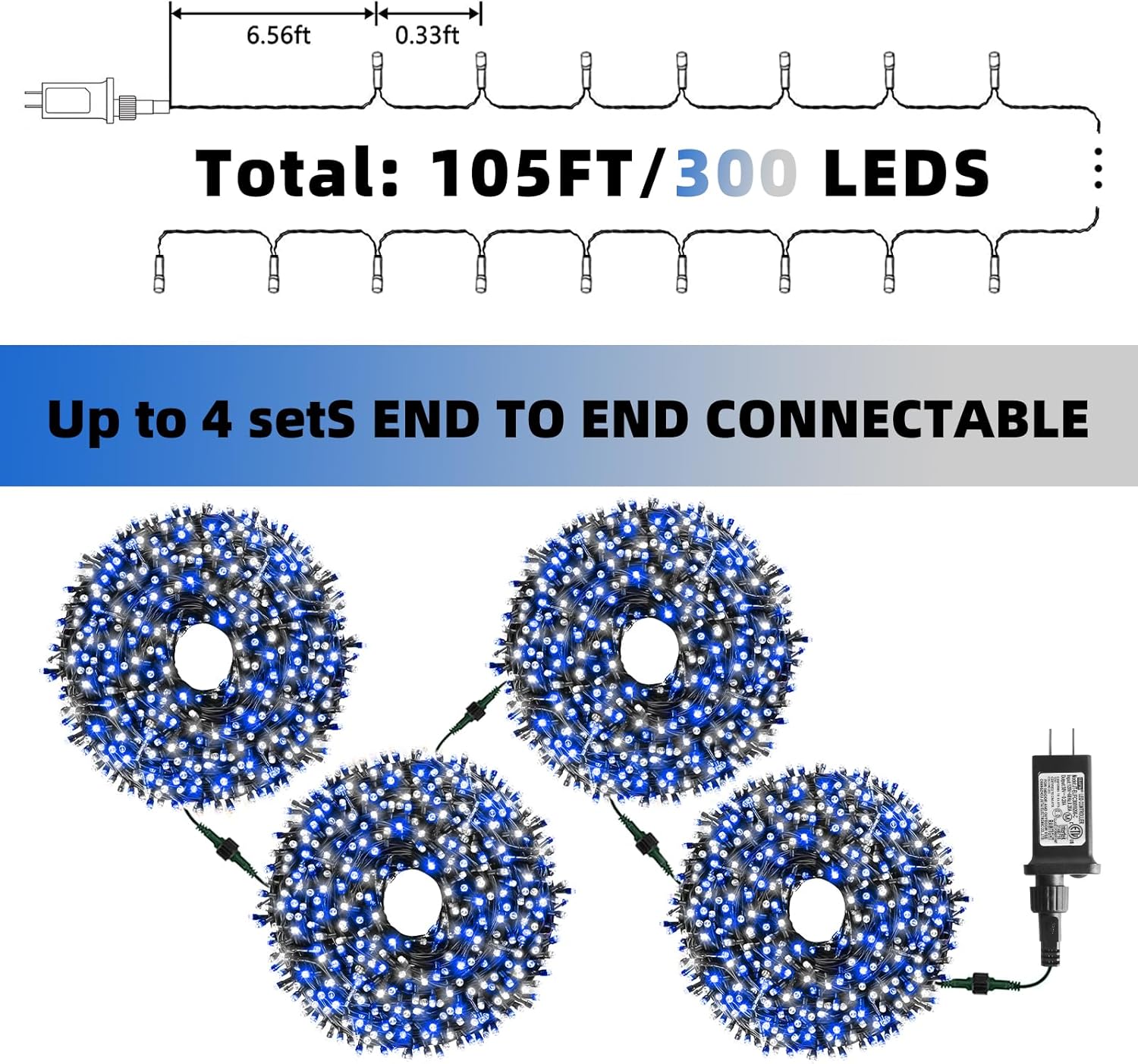 XTF2015 Christmas String Lights, 105ft 300 LED Christmas Lights 8 Modes Memory Function & Timer- UL Certified - Outdoor Indoor Christma s Fairy Lights for Tree, Garden, Party, Wedding(Blue + White)