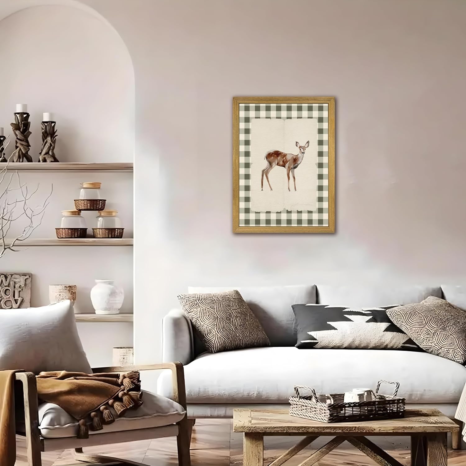 - Charming Woodland Baby Deer Design Wall Art – Features a beautifully illustrated fawn with soft watercolor textures, standing against a vintage-style parchment background and surrounded by a rustic green gingham border for a warm, farmhouse-inspired look.
