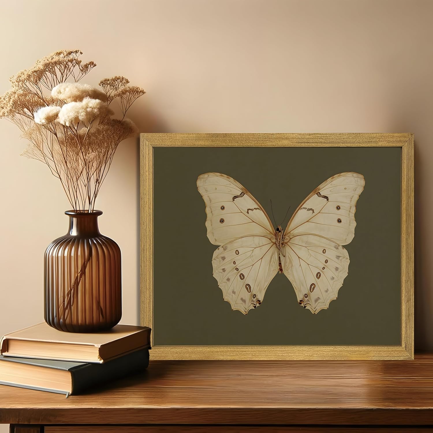 Wood Framed White Butterfly Wall Art, Vintage Butterfly Oil Paintings, Dark Moody Insect Canvas Prints, Boho Sage Green Wall Decor, for Bedroom Kitchen Bathroom Cottagecore Room Decor - 12x16 Inch