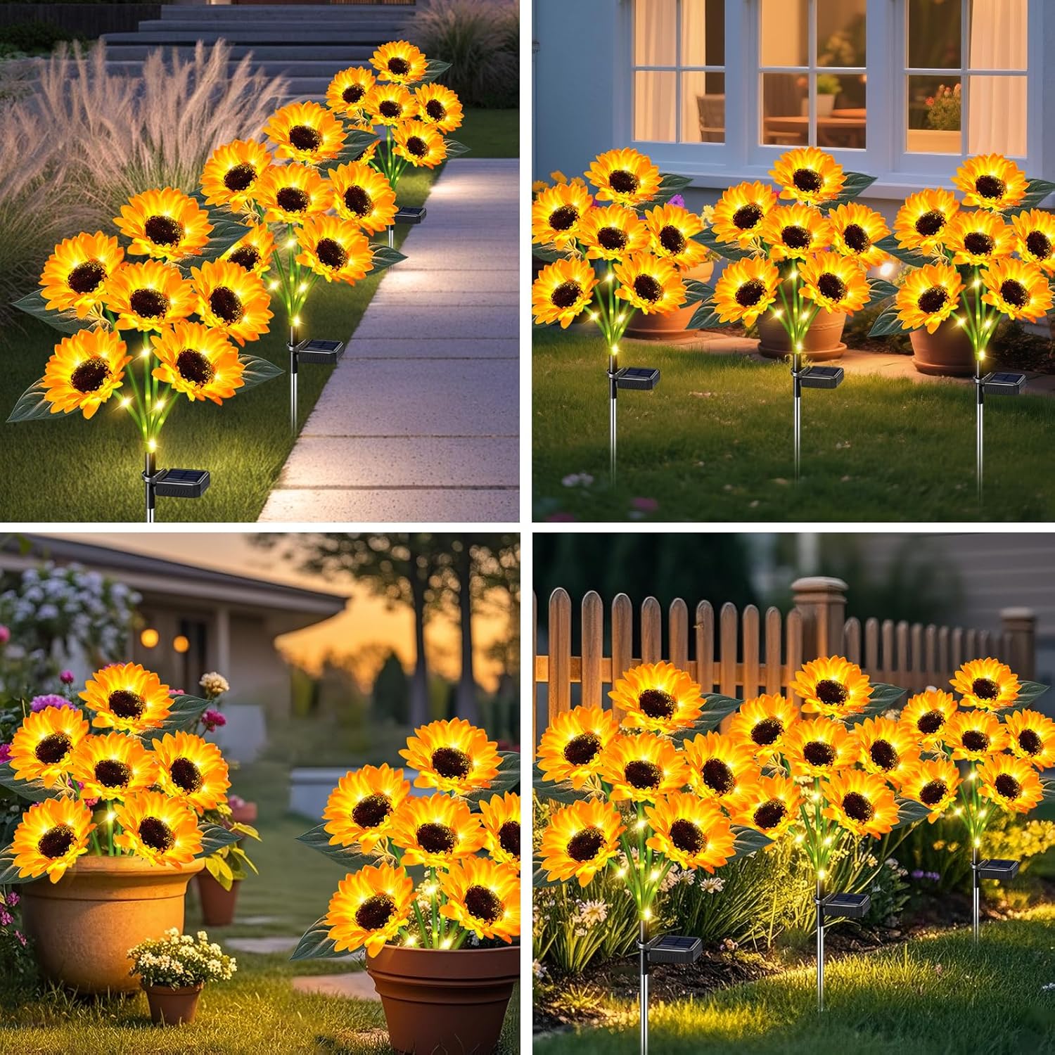 - 【Weatherproof & Durable】Each solar sunflower light is made with fade-resistant flower heads, sturdy metal stems, and reinforced ABS light poles. With IP65 waterproof protection, these solar lights outdoor waterproof withstand rain, wind, snow, and sun, perfect for garden decor for outside