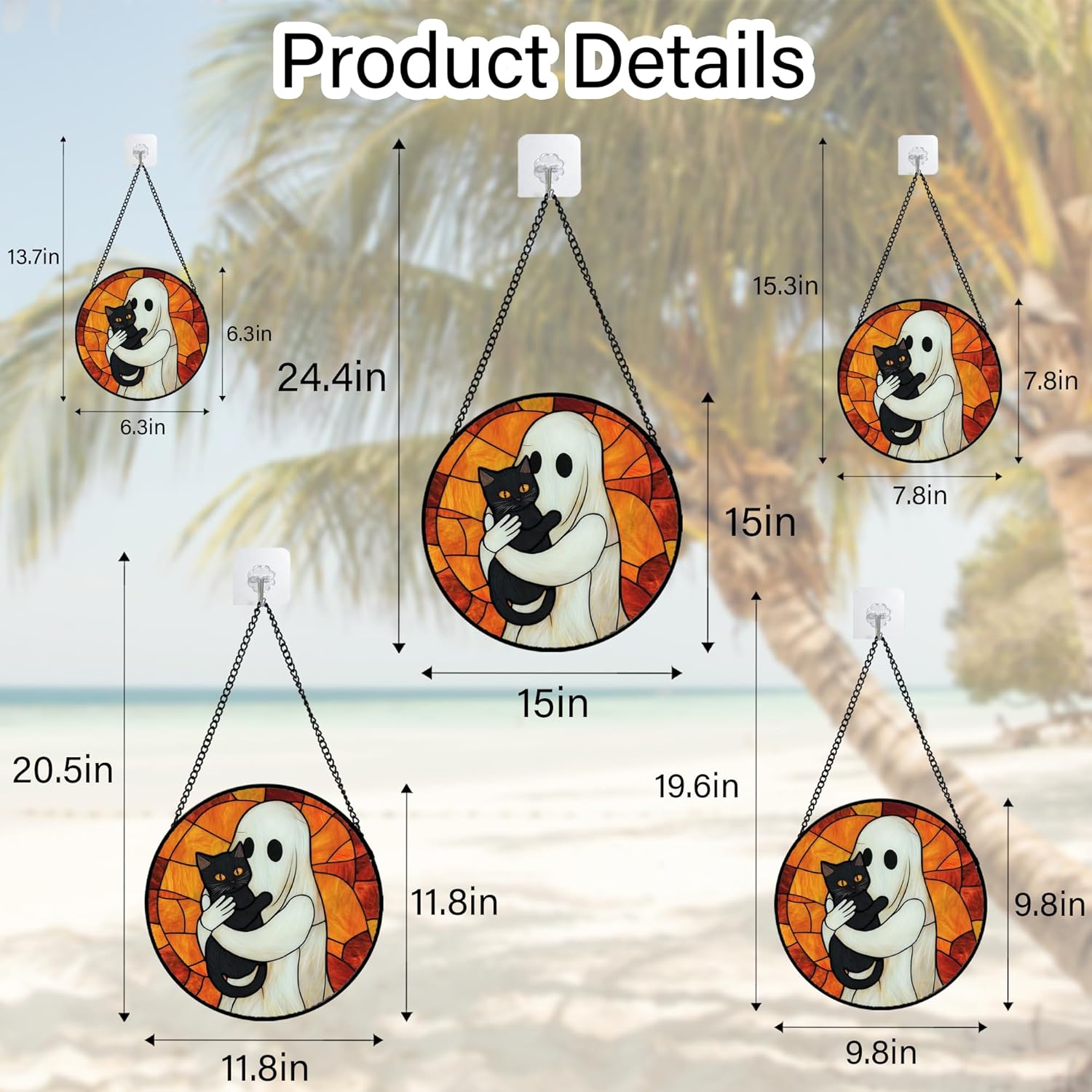 Stained Glass Window Hanging - Halloween Decorations White Ghost Black Cat Suncatcher for Doors Garden Spooky Funny Orange Sun Catchers Gothic Decor Horror Gifts for Women Men Friend 15 in