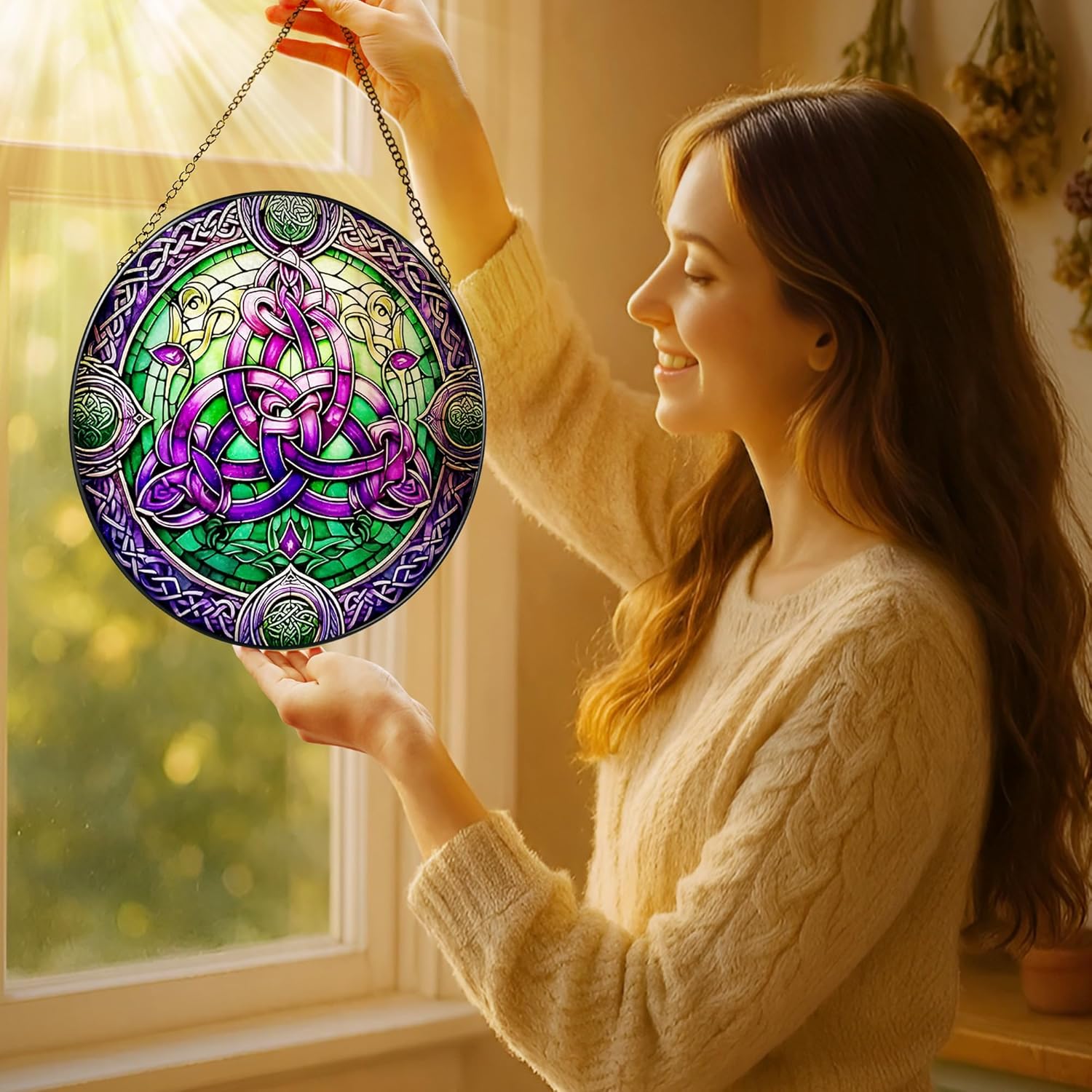 Stained Glass Window Hanging, LAOWEIKI 8'' Celtic Knot Suncatcher, Stained Glass Ornament, Suncatchers for Windows Hanging, Window Decor, Outdoor or Indoor, Gifts for Friends, Women, Art Lover